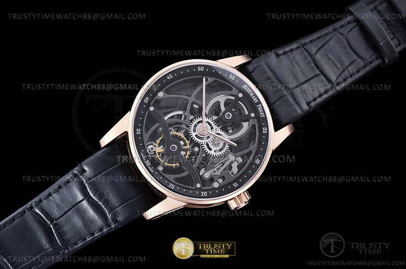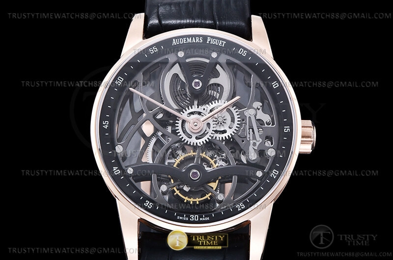 Часы Audemars Piguet из коллекции Code 11.59. Классические мужские часы Audemars Piguet Royal Oak Tourbillon Openworked 26600OR.OO.D002CR.01 премиального качества (Артикул магазина: AP-1179) оснащены надежным автоматическим механизмом с ручным заводом калибра AP2948, в котором реализованы следующие функции: часова и минутка стрелки, а так же турбийон. Круглый корпус часов розового цвета, имеющий размер 41 мм и высоту 11 мм превосходно дополнит образ и украсит запястье своего обладателя. Для изготовления часов Audemars Piguet Royal Oak Tourbillon Openworked 26600OR.OO.D002CR.01 предлагаемых в нашем интернет-магазине, применяются нержавеющая сталь 316L высокого качества (Швейцарский стандарт), а так же сапфировое стекло высокой прочности, благодаря чему обеспечивается максимальная защита от сколов и механических повреждений. Отличительной чертой данной модели является скелетонизированный циферблат, часовые индексы которого обеспечивают часовые метки. Завершает образ кожаный ремешок черного цвета с фирменной классической застежкой Audemars Piguet. Водонепроницаемость данной модели составляет 30М (WR30) – допускается минимальное воздействие с водой.