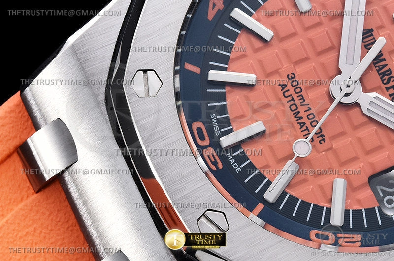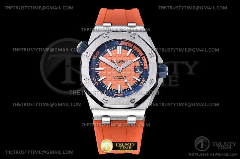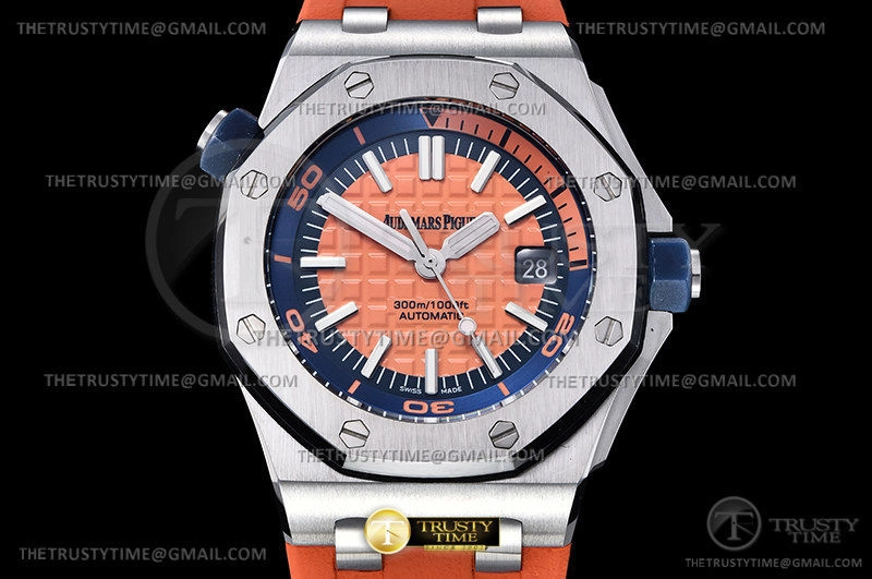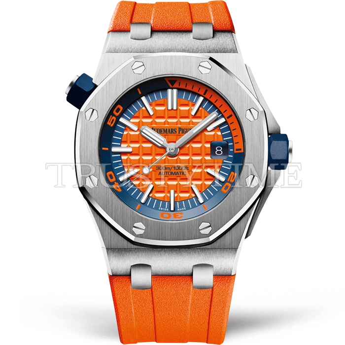 Часы Audemars Piguet из коллекции Royal Oak Offshore Diver. Спортивные мужские часы Audemars Piguet Royal Oak Offshore Diver 15710ST.OO.A070CA.01 премиального качества (Артикул магазина: AP-1005) оснащены надежным автоматическим механизмом с автоподзаводом (работает от амплитуды движения руки) калибра AP3120, в котором реализованы следующие функции: часовая, минутная и секундная стрелки, а так же дата. Восьмиугольный корпус часов стального цвета, имеющий размер 42 мм и высоту 13.8 мм превосходно дополнит образ и украсит запястье своего обладателя. Для изготовления часов Audemars Piguet Royal Oak Offshore Diver 15710ST.OO.A070CA.01 предлагаемых в нашем интернет-магазине, применяются нержавеющая сталь 316F высокого качества (Швейцарский стандарт), а так же сапфировое стекло высокой прочности, благодаря чему обеспечивается максимальная защита от сколов и механических повреждений. Отличительной чертой данной модели является оранжевый циферблат, часовые индексы которого обеспечивают часовые метки. Завершает образ каучуковый ремешок оранжевого цвета с фирменной классической застежкой Audemars Piguet. Водонепроницаемость данной модели составляет 30М (WR30) – допускается минимальное воздействие с водой.