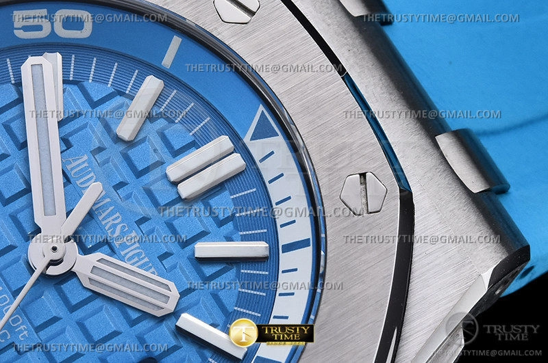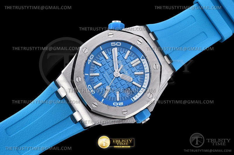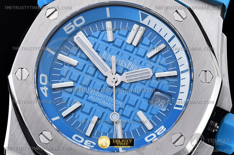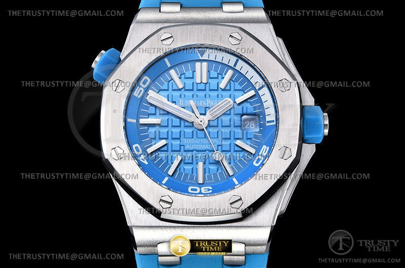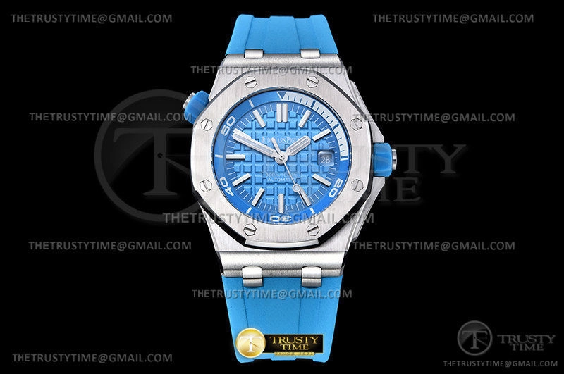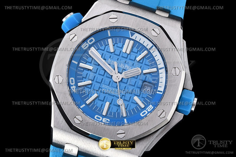 Часы Audemars Piguet из коллекции Royal Oak Offshore Diver. Спортивные мужские часы Audemars Piguet Royal Oak Offshore Diver 15710ST.OO.A032CA.01 премиального качества (Артикул магазина: AP-1011) оснащены надежным автоматическим механизмом с автоподзаводом (работает от амплитуды движения руки) калибра AP3120, в котором реализованы следующие функции: часовая, минутная и секундная стрелки, а так же дата. Восьмиугольный корпус часов стального цвета, имеющий размер 42 мм и высоту 13.8 мм превосходно дополнит образ и украсит запястье своего обладателя. Для изготовления часов Audemars Piguet Royal Oak Offshore Diver 15710ST.OO.A032CA.01 предлагаемых в нашем интернет-магазине, применяются нержавеющая сталь 316F высокого качества (Швейцарский стандарт), а так же сапфировое стекло высокой прочности, благодаря чему обеспечивается максимальная защита от сколов и механических повреждений. Отличительной чертой данной модели является голубой циферблат, часовые индексы которого обеспечивают часовые метки. Завершает образ каучуковый ремешок голубого цвета с фирменной классической застежкой Audemars Piguet. Водонепроницаемость данной модели составляет 30М (WR30) – допускается минимальное воздействие с водой.