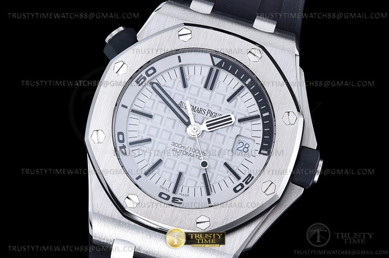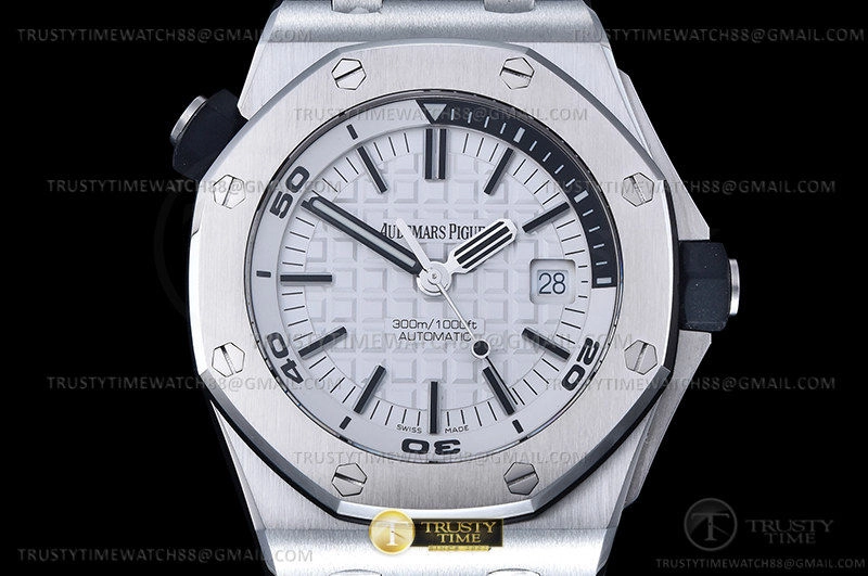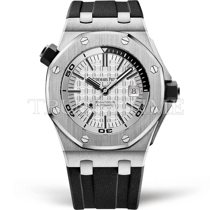 Часы Audemars Piguet из коллекции Royal Oak Offshore Diver. Спортивные мужские часы Audemars Piguet Royal Oak Offshore Diver 15710ST.OO.A002CA.02 премиального качества (Артикул магазина: AP-0892) оснащены надежным автоматическим механизмом с автоподзаводом (работает от амплитуды движения руки) калибра AP3120, в котором реализованы следующие функции: часовая, минутная и секундная стрелки, а так же дата. Восьмиугольный корпус часов стального цвета, имеющий размер 42 мм и высоту 13.8 мм превосходно дополнит образ и украсит запястье своего обладателя. Для изготовления часов Audemars Piguet Royal Oak Offshore Diver 15710ST.OO.A002CA.02 предлагаемых в нашем интернет-магазине, применяются нержавеющая сталь 316F высокого качества (Швейцарский стандарт), а так же сапфировое стекло высокой прочности, благодаря чему обеспечивается максимальная защита от сколов и механических повреждений. Отличительной чертой данной модели является белый циферблат, часовые индексы которого обеспечивают часовые метки. Завершает образ каучуковый ремешок черного цвета с фирменной классической застежкой Audemars Piguet. Водонепроницаемость данной модели составляет 30М (WR30) – допускается минимальное воздействие с водой.