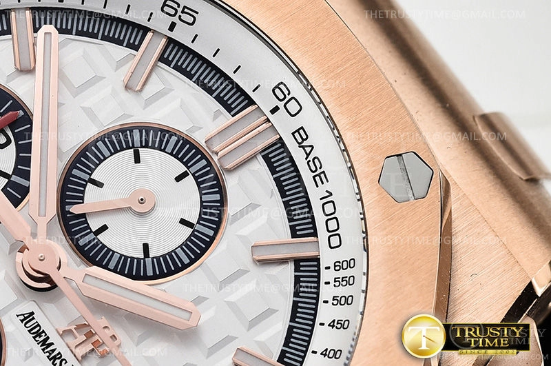 Часы Audemars Piguet из коллекции Royal Oak Offshore Chronograph. Спортивные мужские часы Audemars Piguet Royal Oak Offshore Chronograph Byblos Summer 2017 26408OR.OO.A010CA.01 премиального качества (Артикул магазина: AP-0849) оснащены надежным автоматическим механизмом с автоподзаводом (работает от амплитуды движения руки) калибра AP3126, в котором реализованы следующие функции: часовая, минутная и секундная стрелки, а так же хронограф, дата. Восьмиугольный корпус часов розового цвета, имеющий размер 44 мм и высоту 16 мм превосходно дополнит образ и украсит запястье своего обладателя. Для изготовления часов Audemars Piguet Royal Oak Offshore Chronograph Byblos Summer 2017 26408OR.OO.A010CA.01 предлагаемых в нашем интернет-магазине, применяются нержавеющая сталь 316L высокого качества (Швейцарский стандарт), а так же сапфировое стекло высокой прочности, благодаря чему обеспечивается максимальная защита от сколов и механических повреждений. Отличительной чертой данной модели является белый циферблат, часовые индексы которого обеспечивают часовые метки. Завершает образ каучуковый ремешок белого цвета с фирменной классической застежкой Audemars Piguet. Водонепроницаемость данной модели составляет 30М (WR30) – допускается минимальное воздействие с водой.