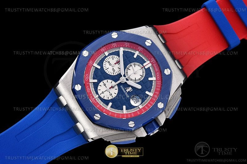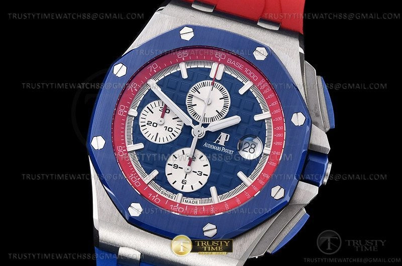 Часы Audemars Piguet из коллекции Royal Oak Offshore Chronograph. Спортивные мужские часы Audemars Piguet Royal Oak Offshore Ryder Cup USA 26400SO.OO.A502CA.01 премиального качества (Артикул магазина: AP-1049) оснащены надежным автоматическим механизмом с автоподзаводом (работает от амплитуды движения руки) калибра AP3126, в котором реализованы следующие функции: часовая, минутная и секундная стрелки, а так же хронограф, дата. Восьмиугольный корпус часов стального цвета, имеющий размер 44 мм и высоту 16 мм превосходно дополнит образ и украсит запястье своего обладателя. Для изготовления часов Audemars Piguet Royal Oak Offshore Ryder Cup USA 26400SO.OO.A502CA.01 предлагаемых в нашем интернет-магазине, применяются нержавеющая сталь 316F высокого качества (Швейцарский стандарт), а так же сапфировое стекло высокой прочности, благодаря чему обеспечивается максимальная защита от сколов и механических повреждений. Отличительной чертой данной модели является синий циферблат, часовые индексы которого обеспечивают часовые метки. Завершает образ каучуковый ремешок красного цвета с фирменной классической застежкой Audemars Piguet. Водонепроницаемость данной модели составляет 30М (WR30) – допускается минимальное воздействие с водой.