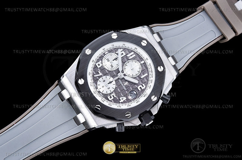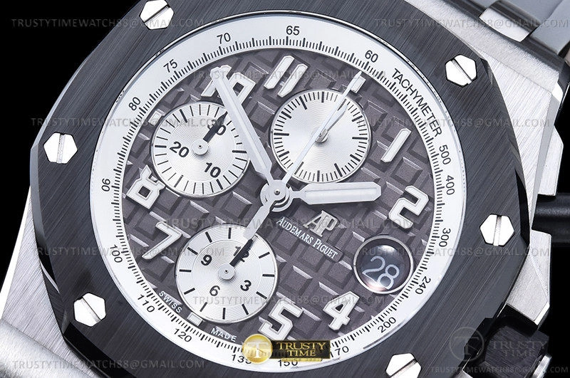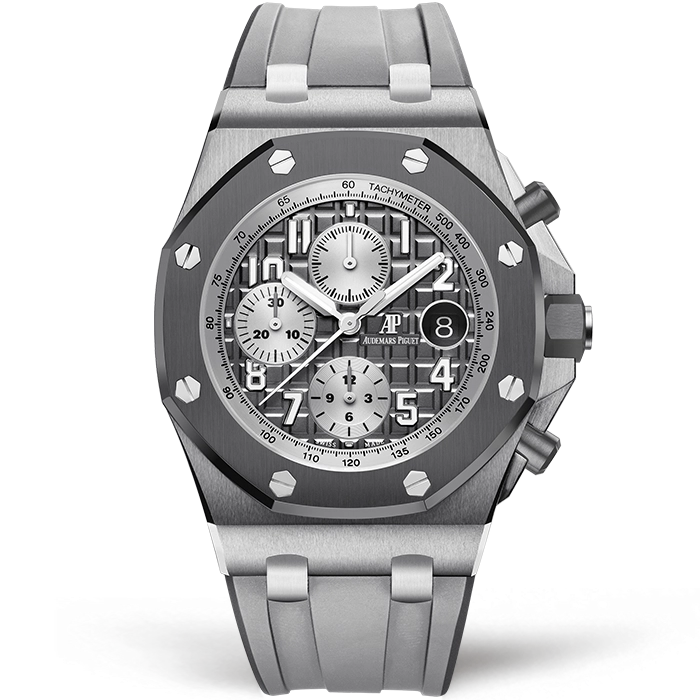 Часы Audemars Piguet из коллекции Royal Oak Offshore Chronograph. Спортивные мужские часы Audemars Piguet Royal Oak Offshore Chronograph 26470IO.OO.A006CA.01.A премиального качества (Артикул магазина: AP-1137) оснащены надежным автоматическим механизмом с автоподзаводом (работает от амплитуды движения руки) калибра AP3126, в котором реализованы следующие функции: часовая, минутная и секундная стрелки, а так же хронограф, дата. Восьмиугольный корпус часов стального цвета, имеющий размер 42 мм и высоту 17 мм превосходно дополнит образ и украсит запястье своего обладателя. Для изготовления часов Audemars Piguet Royal Oak Offshore Chronograph 26470IO.OO.A006CA.01.A предлагаемых в нашем интернет-магазине, применяются нержавеющая сталь 316F высокого качества (Швейцарский стандарт), а так же сапфировое стекло высокой прочности, благодаря чему обеспечивается максимальная защита от сколов и механических повреждений. Отличительной чертой данной модели является серый циферблат, часовые индексы которого обеспечивают арабские цифры. Завершает образ каучуковый ремешок серого цвета с фирменной классической застежкой Audemars Piguet. Водонепроницаемость данной модели составляет 30М (WR30) – допускается минимальное воздействие с водой.