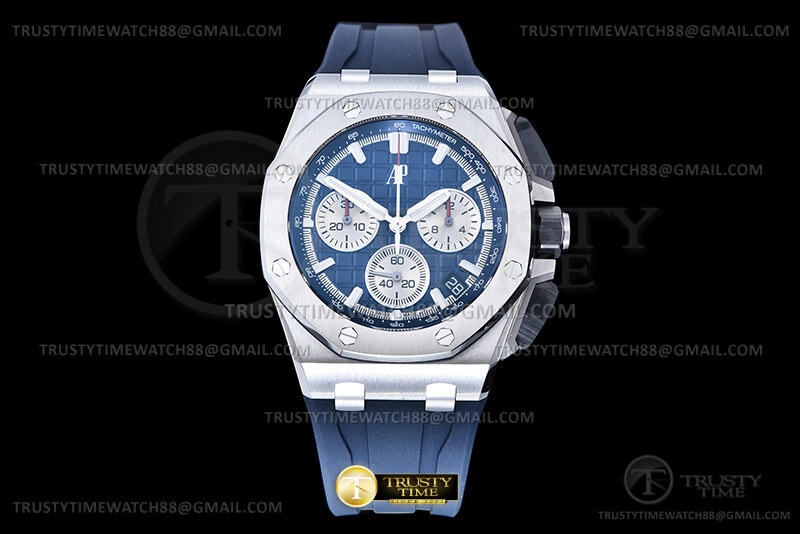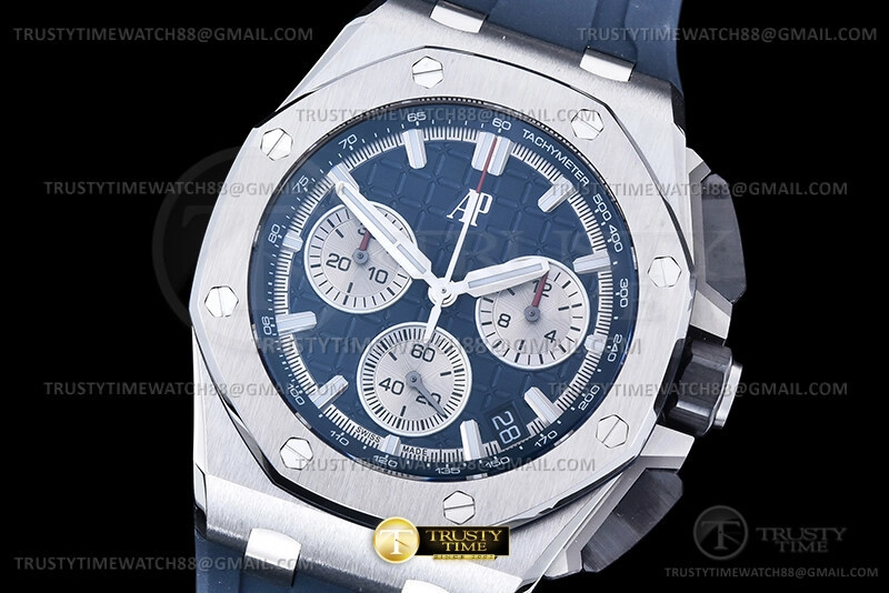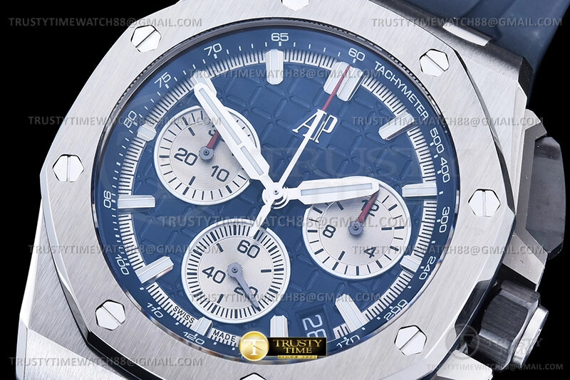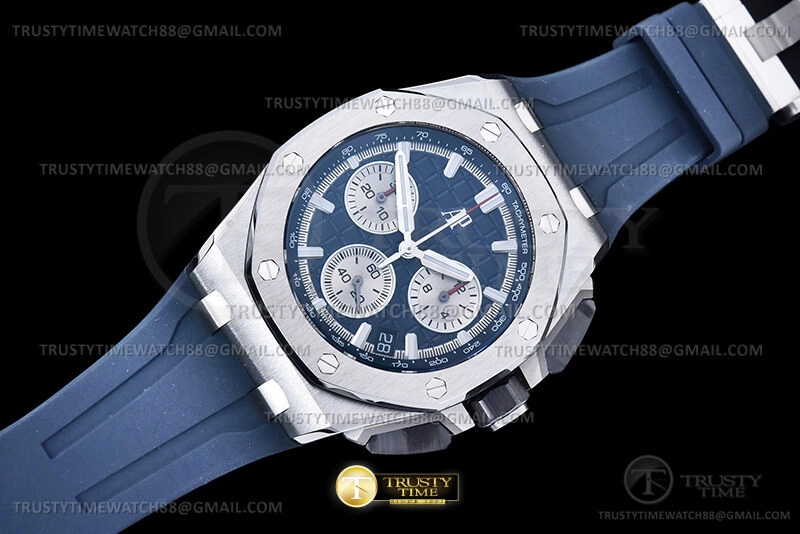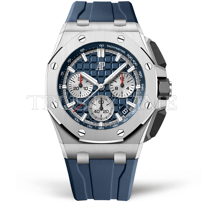 Часы Audemars Piguet из коллекции Royal Oak Offshore Chronograph. Спортивные мужские часы Audemars Piguet Royal Oak Offshore Chronograph 26420TI.OO.A027CA.01 премиального качества (Артикул магазина: AP-1141) оснащены надежным автоматическим механизмом с автоподзаводом (работает от амплитуды движения руки) калибра AP4401, в котором реализованы следующие функции: часовая, минутная и секундная стрелки, а так же дата, хронограф с функцией flyback (мгновенный перезапуск) в наручных часах (chronograph) — это усложнение, которое позволяет мгновенно сбрасывать показания секундомера одним нажатием кнопки. В обычных хронографах для сброса показаний нужно сначала остановить часы, а затем начать заново. Восьмиугольный корпус часов стального цвета, имеющий размер 43 мм и высоту 14.5 мм превосходно дополнит образ и украсит запястье своего обладателя. Для изготовления часов Audemars Piguet Royal Oak Offshore Chronograph 26420TI.OO.A027CA.01 предлагаемых в нашем интернет-магазине, применяются нержавеющая сталь 316L высокого качества (Швейцарский стандарт), а так же сапфировое стекло высокой прочности, благодаря чему обеспечивается максимальная защита от сколов и механических повреждений. Отличительной чертой данной модели является синий циферблат, часовые индексы которого обеспечивают часовые метки. Завершает образ каучуковый ремешок синего цвета с фирменной классической застежкой Audemars Piguet. Водонепроницаемость данной модели составляет 30М (WR30) – допускается минимальное воздействие с водой.
