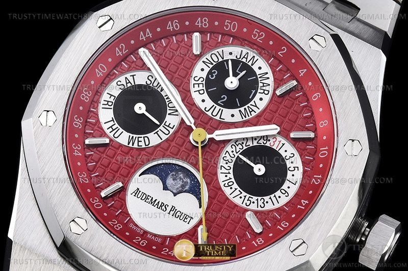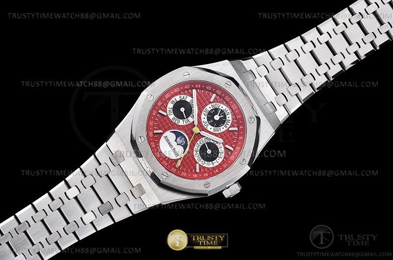 Часы Audemars Piguet из коллекции Royal Oak Perpetual Calendar. Классические мужские часы Audemars Piguet Royal Oak Perpetual Calendar 26607BC.OO.1220BC.01 премиального качества (Артикул магазина: AP-1037) оснащены надежным автоматическим механизмом с автоподзаводом (работает от амплитуды движения руки) калибра AP5134, в котором реализованы следующие функции: часова и минутка стрелки, а так же дата, день недели, фаза луны, месяц, неделя года, високосный год. Восьмиугольный корпус часов стального цвета, имеющий размер 41 мм и высоту 11 мм превосходно дополнит образ и украсит запястье своего обладателя. Для изготовления часов Audemars Piguet Royal Oak Perpetual Calendar 26607BC.OO.1220BC.01 предлагаемых в нашем интернет-магазине, применяются нержавеющая сталь 316F высокого качества (Швейцарский стандарт), а так же сапфировое стекло высокой прочности, благодаря чему обеспечивается максимальная защита от сколов и механических повреждений. Отличительной чертой данной модели является красный циферблат, часовые индексы которого обеспечивают часовые метки. Завершает образ браслет из нержавеющей стали стального цвета с фирменной раскладывающейся застежкой Audemars Piguet. Водонепроницаемость данной модели составляет 30М (WR30) – допускается минимальное воздействие с водой.