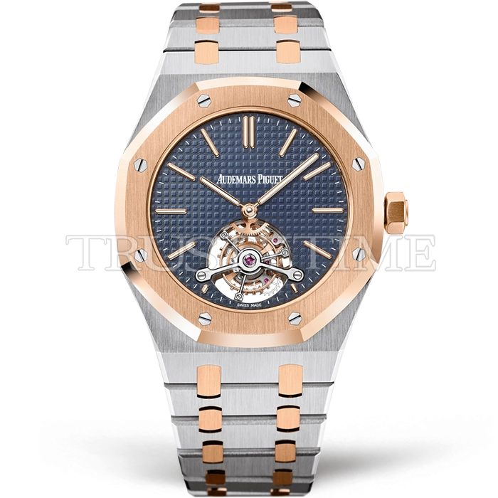 Часы Audemars Piguet из коллекции Royal Oak Tourbillon. Классические мужские часы Audemars Piguet Royal Oak Tourbillon Extra-Thin 26517SR.OO.1220SR.01 премиального качества (Артикул магазина: AP-0478) оснащены надежным автоматическим механизмом с ручным заводом калибра Seagull Handwind Tourbillon, в котором реализованы следующие функции: часова и минутка стрелки, а так же турбийон. Восьмиугольный корпус часов комбинированного сталь с розового золота цвета, имеющий размер 41 мм и высоту 11.2 мм превосходно дополнит образ и украсит запястье своего обладателя. Для изготовления часов Audemars Piguet Royal Oak Tourbillon Extra-Thin 26517SR.OO.1220SR.01 предлагаемых в нашем интернет-магазине, применяются нержавеющая сталь 316L высокого качества (Швейцарский стандарт), а так же сапфировое стекло высокой прочности, благодаря чему обеспечивается максимальная защита от сколов и механических повреждений. Отличительной чертой данной модели является синий циферблат, часовые индексы которого обеспечивают часовые метки. Завершает образ браслет из нержавеющей стали комбинированного сталь с розовым золотом цвета с фирменной раскладывающейся застежкой Audemars Piguet. Водонепроницаемость данной модели составляет 30М (WR30) – допускается минимальное воздействие с водой.
