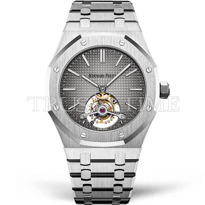 Часы Audemars Piguet из коллекции Royal Oak Tourbillon. Классические мужские часы Audemars Piguet Royal Oak Tourbillon Extra-Thin 26510PT.OO.1220PT.01 премиального качества (Артикул магазина: AP-0946) оснащены надежным автоматическим механизмом с ручным заводом калибра Seagull Handwind Tourbillon, в котором реализованы следующие функции: часова и минутка стрелки, а так же турбийон. Восьмиугольный корпус часов стального цвета, имеющий размер 41 мм и высоту 11 мм превосходно дополнит образ и украсит запястье своего обладателя. Для изготовления часов Audemars Piguet Royal Oak Tourbillon Extra-Thin 26510PT.OO.1220PT.01 предлагаемых в нашем интернет-магазине, применяются нержавеющая сталь 316F высокого качества (Швейцарский стандарт), а так же сапфировое стекло высокой прочности, благодаря чему обеспечивается максимальная защита от сколов и механических повреждений. Отличительной чертой данной модели является серый циферблат, часовые индексы которого обеспечивают часовые метки. Завершает образ браслет из нержавеющей стали стального цвета с фирменной раскладывающейся застежкой Audemars Piguet. Водонепроницаемость данной модели составляет 30М (WR30) – допускается минимальное воздействие с водой.