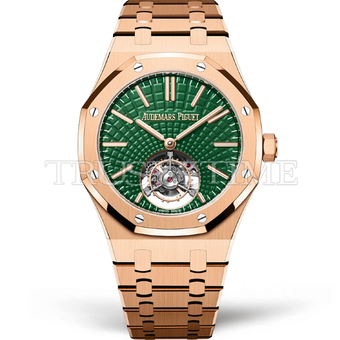Часы Audemars Piguet из коллекции Royal Oak Tourbillon. Классические мужские часы Audemars Piguet Royal Oak Tourbillon Extra-Thin 26533OR.OO.1220OR.01 премиального качества (Артикул магазина: AP-1057) оснащены надежным автоматическим механизмом с автоподзаводом (работает от амплитуды движения руки) калибра AP2950, в котором реализованы следующие функции: часова и минутка стрелки, а так же турбийон. Восьмиугольный корпус часов розового цвета, имеющий размер 41 мм и высоту 11.2 мм превосходно дополнит образ и украсит запястье своего обладателя. Для изготовления часов Audemars Piguet Royal Oak Tourbillon Extra-Thin 26533OR.OO.1220OR.01 предлагаемых в нашем интернет-магазине, применяются нержавеющая сталь 316L высокого качества (Швейцарский стандарт), а так же сапфировое стекло высокой прочности, благодаря чему обеспечивается максимальная защита от сколов и механических повреждений. Отличительной чертой данной модели является зеленый циферблат, часовые индексы которого обеспечивают часовые метки. Завершает образ браслет из нержавеющей стали цвета розового золота с фирменной раскладывающейся застежкой Audemars Piguet. Водонепроницаемость данной модели составляет 30М (WR30) – допускается минимальное воздействие с водой.