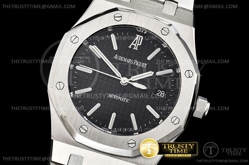 Часы Audemars Piguet из коллекции Royal Oak. Классические мужские часы Audemars Piguet Royal Oak 39mm 15300ST.OO.1220ST.03 премиального качества (Артикул магазина: AP-0666) оснащены надежным автоматическим механизмом с автоподзаводом (работает от амплитуды движения руки) калибра AP3120, в котором реализованы следующие функции: часовая, минутная и секундная стрелки, а так же дата. Восьмиугольный корпус часов стального цвета, имеющий размер 39 мм и высоту 11 мм превосходно дополнит образ и украсит запястье своего обладателя. Для изготовления часов Audemars Piguet Royal Oak 39mm 15300ST.OO.1220ST.03 предлагаемых в нашем интернет-магазине, применяются нержавеющая сталь 316F высокого качества (Швейцарский стандарт), а так же сапфировое стекло высокой прочности, благодаря чему обеспечивается максимальная защита от сколов и механических повреждений. Отличительной чертой данной модели является черный циферблат, часовые индексы которого обеспечивают часовые метки. Завершает образ браслет из нержавеющей стали стального цвета с фирменной раскладывающейся застежкой Audemars Piguet. Водонепроницаемость данной модели составляет 30М (WR30) – допускается минимальное воздействие с водой.