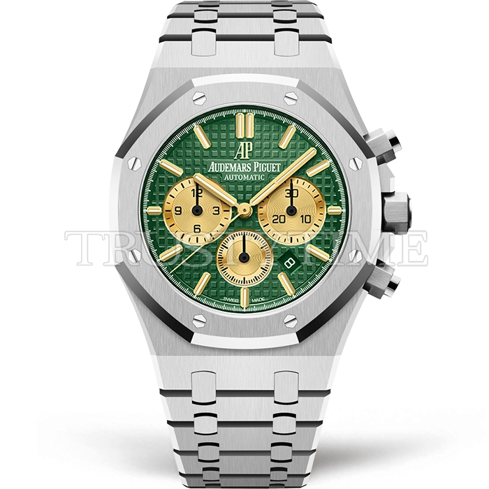Часы Audemars Piguet из коллекции Royal Oak Chronograph. Спортивные мужские часы Audemars Piguet Royal Oak Chronograph 26332PT.OO.1220PT.0 премиального качества (Артикул магазина: AP-0468) оснащены надежным автоматическим механизмом с автоподзаводом (работает от амплитуды движения руки) калибра AP2385, в котором реализованы следующие функции: часовая, минутная и секундная стрелки, а так же хронограф, дата. Восьмиугольный корпус часов стального цвета, имеющий размер 41 мм и высоту 14 мм превосходно дополнит образ и украсит запястье своего обладателя. Для изготовления часов Audemars Piguet Royal Oak Chronograph 26332PT.OO.1220PT.0 предлагаемых в нашем интернет-магазине, применяются нержавеющая сталь 316L высокого качества (Швейцарский стандарт), а так же сапфировое стекло высокой прочности, благодаря чему обеспечивается максимальная защита от сколов и механических повреждений. Отличительной чертой данной модели является зеленый циферблат, часовые индексы которого обеспечивают часовые метки. Завершает образ браслет из нержавеющей стали стального цвета с фирменной раскладывающейся застежкой Audemars Piguet. Водонепроницаемость данной модели составляет 30М (WR30) – допускается минимальное воздействие с водой.