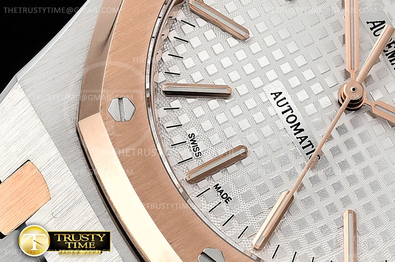 Часы Audemars Piguet из коллекции Royal Oak. Классические мужские часы Audemars Piguet Royal Oak Automatic II 15400SR.OO.1220SR.01 премиального качества (Артикул магазина: AP-0694) оснащены надежным автоматическим механизмом с автоподзаводом (работает от амплитуды движения руки) калибра AP3120, в котором реализованы следующие функции: часовая, минутная и секундная стрелки, а так же дата. Восьмиугольный корпус часов комбинированного сталь с розового золота цвета, имеющий размер 41 мм и высоту 10.7 мм превосходно дополнит образ и украсит запястье своего обладателя. Для изготовления часов Audemars Piguet Royal Oak Automatic II 15400SR.OO.1220SR.01 предлагаемых в нашем интернет-магазине, применяются нержавеющая сталь 316F высокого качества (Швейцарский стандарт), а так же сапфировое стекло высокой прочности, благодаря чему обеспечивается максимальная защита от сколов и механических повреждений. Отличительной чертой данной модели является серебристый циферблат, часовые индексы которого обеспечивают часовые метки. Завершает образ браслет из нержавеющей стали комбинированного сталь с розовым золотом цвета с фирменной раскладывающейся застежкой Audemars Piguet. Водонепроницаемость данной модели составляет 30М (WR30) – допускается минимальное воздействие с водой.