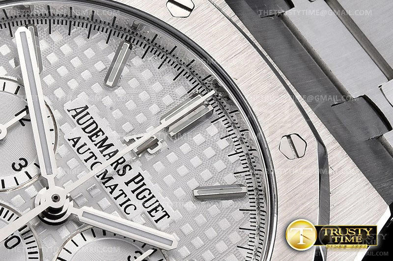 Часы Audemars Piguet из коллекции Royal Oak Chronograph. Спортивные мужские часы Audemars Piguet Royal Oak Chronograph 26320ST.OO.1220ST.02 премиального качества (Артикул магазина: AP-0767) оснащены надежным автоматическим механизмом с автоподзаводом (работает от амплитуды движения руки) калибра AP2385, в котором реализованы следующие функции: часовая, минутная и секундная стрелки, а так же хронограф, дата. Восьмиугольный корпус часов стального цвета, имеющий размер 41 мм и высоту 15 мм превосходно дополнит образ и украсит запястье своего обладателя. Для изготовления часов Audemars Piguet Royal Oak Chronograph 26320ST.OO.1220ST.02 предлагаемых в нашем интернет-магазине, применяются нержавеющая сталь 316F высокого качества (Швейцарский стандарт), а так же сапфировое стекло высокой прочности, благодаря чему обеспечивается максимальная защита от сколов и механических повреждений. Отличительной чертой данной модели является серебристый циферблат, часовые индексы которого обеспечивают часовые метки. Завершает образ браслет из нержавеющей стали стального цвета с фирменной раскладывающейся застежкой Audemars Piguet. Водонепроницаемость данной модели составляет 30М (WR30) – допускается минимальное воздействие с водой.