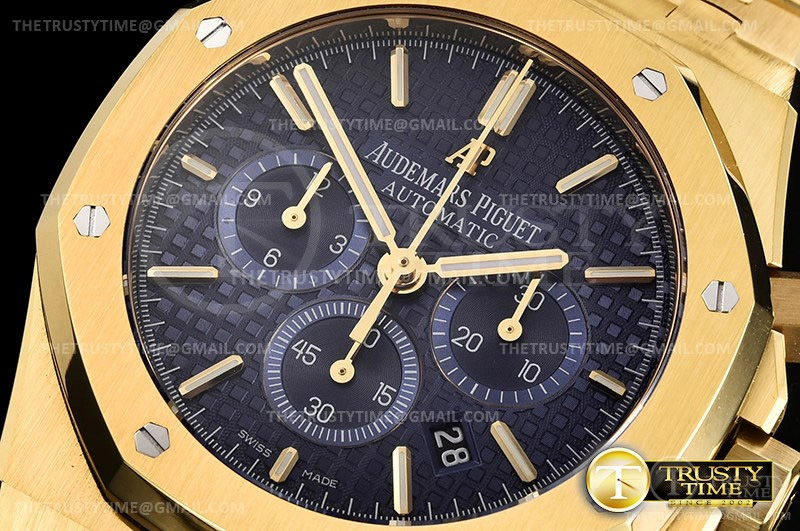 Часы Audemars Piguet из коллекции Royal Oak Chronograph. Спортивные мужские часы Audemars Piguet Royal Oak Chronograph 26320BA.OO.1220BA.02 премиального качества (Артикул магазина: AP-0760) оснащены надежным автоматическим механизмом с автоподзаводом (работает от амплитуды движения руки) калибра AP2385, в котором реализованы следующие функции: часовая, минутная и секундная стрелки, а так же хронограф, дата. Восьмиугольный корпус часов цветы желтой золота, имеющий размер 41 мм и высоту 15 мм превосходно дополнит образ и украсит запястье своего обладателя. Для изготовления часов Audemars Piguet Royal Oak Chronograph 26320BA.OO.1220BA.02 предлагаемых в нашем интернет-магазине, применяются нержавеющая сталь 316F высокого качества (Швейцарский стандарт), а так же сапфировое стекло высокой прочности, благодаря чему обеспечивается максимальная защита от сколов и механических повреждений. Отличительной чертой данной модели является синий циферблат, часовые индексы которого обеспечивают часовые метки. Завершает образ браслет из нержавеющей стали цвета желтого золота с фирменной раскладывающейся застежкой Audemars Piguet. Водонепроницаемость данной модели составляет 30М (WR30) – допускается минимальное воздействие с водой.