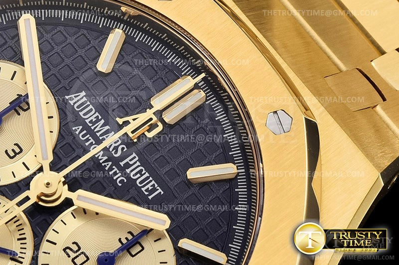 Часы Audemars Piguet из коллекции Royal Oak Chronograph. Спортивные мужские часы Audemars Piguet Royal Oak Chronograph 26331BA.OO.1220BA.01 премиального качества (Артикул магазина: AP-0761) оснащены надежным автоматическим механизмом с автоподзаводом (работает от амплитуды движения руки) калибра AP2385, в котором реализованы следующие функции: часовая, минутная и секундная стрелки, а так же хронограф, дата. Восьмиугольный корпус часов цветы желтой золота, имеющий размер 41 мм и высоту 15 мм превосходно дополнит образ и украсит запястье своего обладателя. Для изготовления часов Audemars Piguet Royal Oak Chronograph 26331BA.OO.1220BA.01 предлагаемых в нашем интернет-магазине, применяются нержавеющая сталь 316F высокого качества (Швейцарский стандарт), а так же сапфировое стекло высокой прочности, благодаря чему обеспечивается максимальная защита от сколов и механических повреждений. Отличительной чертой данной модели является синий циферблат, часовые индексы которого обеспечивают часовые метки. Завершает образ браслет из нержавеющей стали цвета желтого золота с фирменной раскладывающейся застежкой Audemars Piguet. Водонепроницаемость данной модели составляет 30М (WR30) – допускается минимальное воздействие с водой.