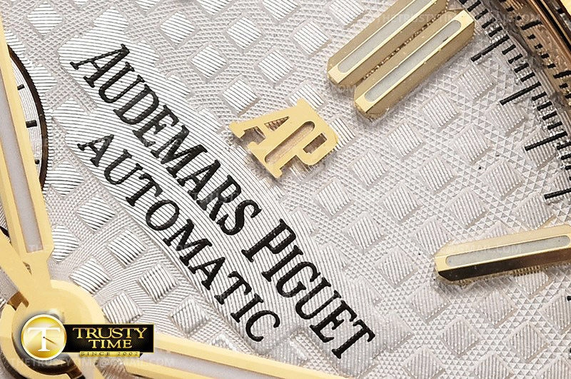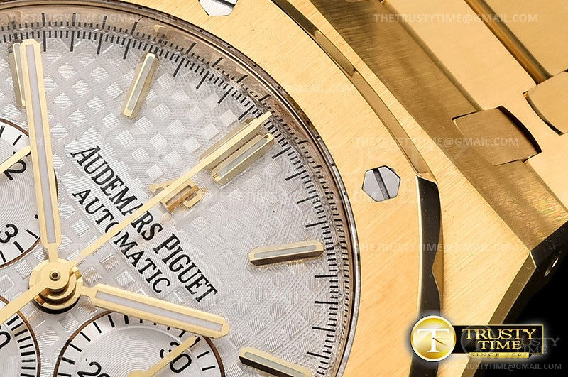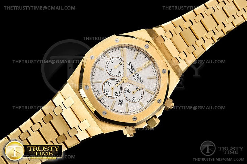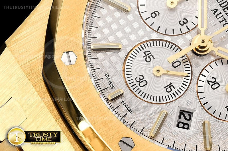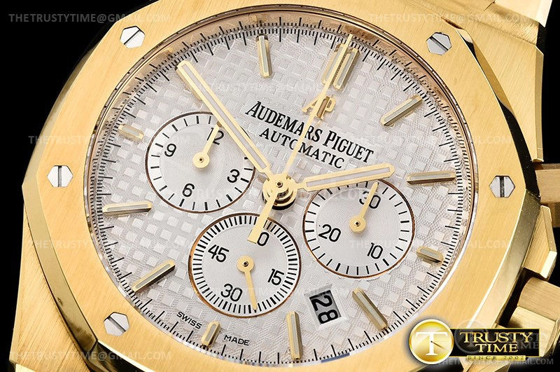 Часы Audemars Piguet из коллекции Royal Oak Chronograph. Спортивные мужские часы Audemars Piguet Royal Oak Chronograph 26320BA.OO.1220BA.01 премиального качества (Артикул магазина: AP-0762) оснащены надежным автоматическим механизмом с автоподзаводом (работает от амплитуды движения руки) калибра AP2385, в котором реализованы следующие функции: часовая, минутная и секундная стрелки, а так же хронограф, дата. Восьмиугольный корпус часов цветы желтой золота, имеющий размер 41 мм и высоту 15 мм превосходно дополнит образ и украсит запястье своего обладателя. Для изготовления часов Audemars Piguet Royal Oak Chronograph 26320BA.OO.1220BA.01 предлагаемых в нашем интернет-магазине, применяются нержавеющая сталь 316F высокого качества (Швейцарский стандарт), а так же сапфировое стекло высокой прочности, благодаря чему обеспечивается максимальная защита от сколов и механических повреждений. Отличительной чертой данной модели является серебристый циферблат, часовые индексы которого обеспечивают часовые метки. Завершает образ браслет из нержавеющей стали цвета желтого золота с фирменной раскладывающейся застежкой Audemars Piguet. Водонепроницаемость данной модели составляет 30М (WR30) – допускается минимальное воздействие с водой.