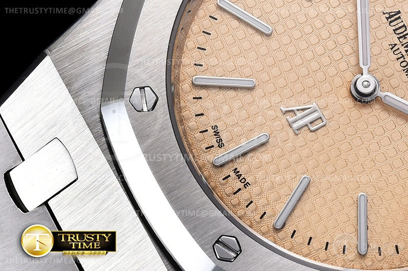 Часы Audemars Piguet из коллекции Royal Oak Jumbo. Классические мужские часы Audemars Piguet Royal Oak Jumbo Extra-thin 15202BC.OO.1240BC.01 премиального качества (Артикул магазина: AP-0964) оснащены надежным автоматическим механизмом с автоподзаводом (работает от амплитуды движения руки) калибра AP2121, в котором реализованы следующие функции: часова и минутка стрелки, а так же дата. Восьмиугольный корпус часов стального цвета, имеющий размер 39 мм и высоту 9 мм превосходно дополнит образ и украсит запястье своего обладателя. Для изготовления часов Audemars Piguet Royal Oak Jumbo Extra-thin 15202BC.OO.1240BC.01 предлагаемых в нашем интернет-магазине, применяются нержавеющая сталь 316F высокого качества (Швейцарский стандарт), а так же сапфировое стекло высокой прочности, благодаря чему обеспечивается максимальная защита от сколов и механических повреждений. Отличительной чертой данной модели является золотой циферблат, часовые индексы которого обеспечивают часовые метки. Завершает образ браслет из нержавеющей стали стального цвета с фирменной раскладывающейся застежкой Audemars Piguet. Водонепроницаемость данной модели составляет 30М (WR30) – допускается минимальное воздействие с водой.