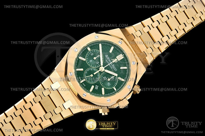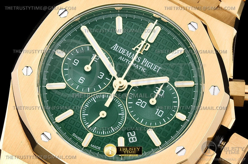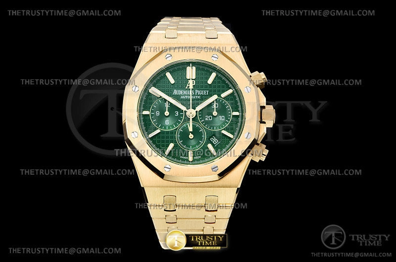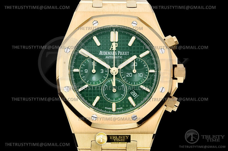 Часы Audemars Piguet из коллекции Royal Oak Chronograph. Спортивные мужские часы Audemars Piguet Royal Oak Selfwinding Chronograph 26331BA.OO.1220BA.02 премиального качества (Артикул магазина: AP-1014) оснащены надежным автоматическим механизмом с автоподзаводом (работает от амплитуды движения руки) калибра AP2385, в котором реализованы следующие функции: часовая, минутная и секундная стрелки, а так же хронограф, дата. Восьмиугольный корпус часов цветы желтой золота, имеющий размер 41 мм и высоту 15 мм превосходно дополнит образ и украсит запястье своего обладателя. Для изготовления часов Audemars Piguet Royal Oak Selfwinding Chronograph 26331BA.OO.1220BA.02 предлагаемых в нашем интернет-магазине, применяются нержавеющая сталь 316F высокого качества (Швейцарский стандарт), а так же сапфировое стекло высокой прочности, благодаря чему обеспечивается максимальная защита от сколов и механических повреждений. Отличительной чертой данной модели является зеленый циферблат, часовые индексы которого обеспечивают часовые метки. Завершает образ браслет из нержавеющей стали цвета желтого золота с фирменной раскладывающейся застежкой Audemars Piguet. Водонепроницаемость данной модели составляет 30М (WR30) – допускается минимальное воздействие с водой.