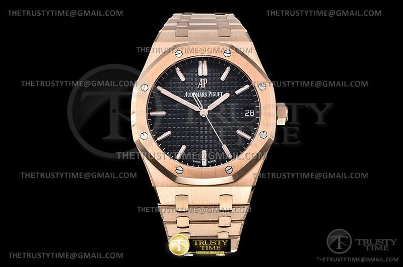Часы Audemars Piguet из коллекции Royal Oak. Классические мужские часы Audemars Piguet Royal Oak Selfwinding II 15500OR.OO.1220OR.01 премиального качества (Артикул магазина: AP-1019) оснащены надежным автоматическим механизмом с автоподзаводом (работает от амплитуды движения руки) калибра AP4302, в котором реализованы следующие функции: часовая, минутная и секундная стрелки, а так же дата. Восьмиугольный корпус часов розового цвета, имеющий размер 41 мм и высоту 11 мм превосходно дополнит образ и украсит запястье своего обладателя. Для изготовления часов Audemars Piguet Royal Oak Selfwinding II 15500OR.OO.1220OR.01 предлагаемых в нашем интернет-магазине, применяются нержавеющая сталь 316F высокого качества (Швейцарский стандарт), а так же сапфировое стекло высокой прочности, благодаря чему обеспечивается максимальная защита от сколов и механических повреждений. Отличительной чертой данной модели является черный циферблат, часовые индексы которого обеспечивают часовые метки. Завершает образ браслет из нержавеющей стали цвета розового золота с фирменной раскладывающейся застежкой Audemars Piguet. Водонепроницаемость данной модели составляет 30М (WR30) – допускается минимальное воздействие с водой.