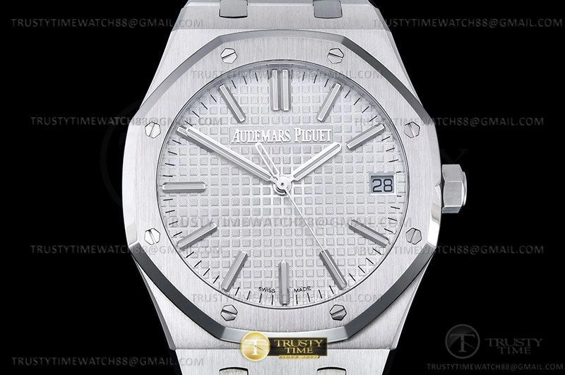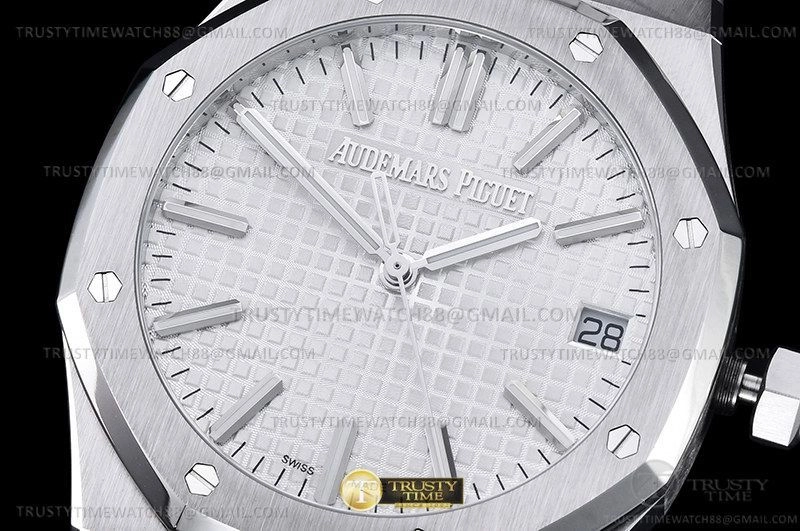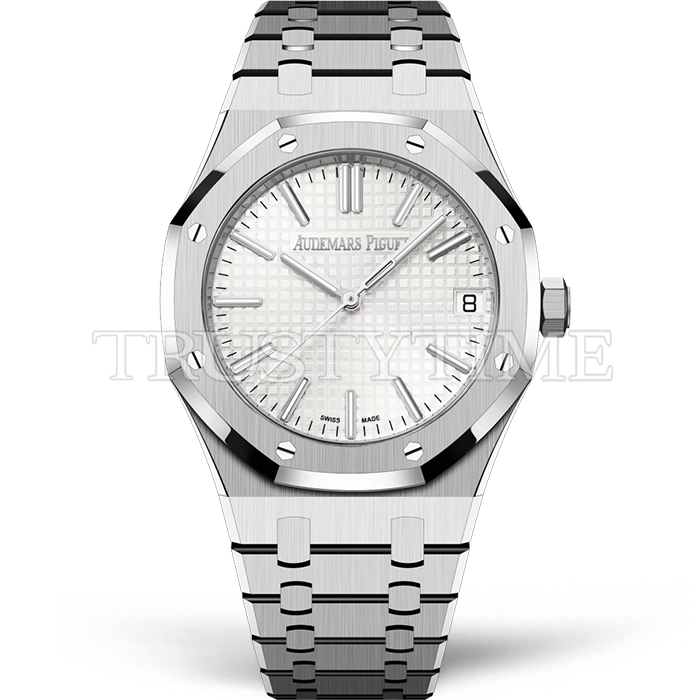 Часы Audemars Piguet из коллекции Royal Oak. Классические мужские часы Audemars Piguet Royal Oak Selfwinding 50th Anniversary 15510ST.OO.1320ST.03 премиального качества (Артикул магазина: AP-1107) оснащены надежным автоматическим механизмом с автоподзаводом (работает от амплитуды движения руки) калибра AP4302, в котором реализованы следующие функции: часовая, минутная и секундная стрелки, а так же дата. Восьмиугольный корпус часов стального цвета, имеющий размер 41 мм и высоту 10 мм превосходно дополнит образ и украсит запястье своего обладателя. Для изготовления часов Audemars Piguet Royal Oak Selfwinding 50th Anniversary 15510ST.OO.1320ST.03 предлагаемых в нашем интернет-магазине, применяются нержавеющая сталь 316F высокого качества (Швейцарский стандарт), а так же сапфировое стекло высокой прочности, благодаря чему обеспечивается максимальная защита от сколов и механических повреждений. Отличительной чертой данной модели является белый циферблат, часовые индексы которого обеспечивают часовые метки. Завершает образ браслет из нержавеющей стали стального цвета с фирменной раскладывающейся застежкой Audemars Piguet. Водонепроницаемость данной модели составляет 30М (WR30) – допускается минимальное воздействие с водой.