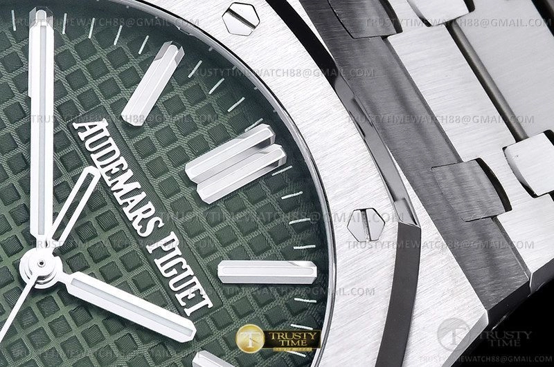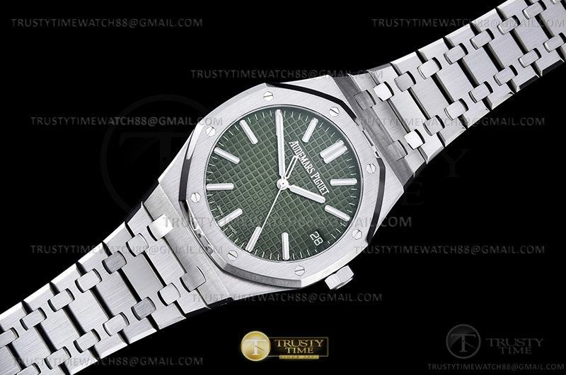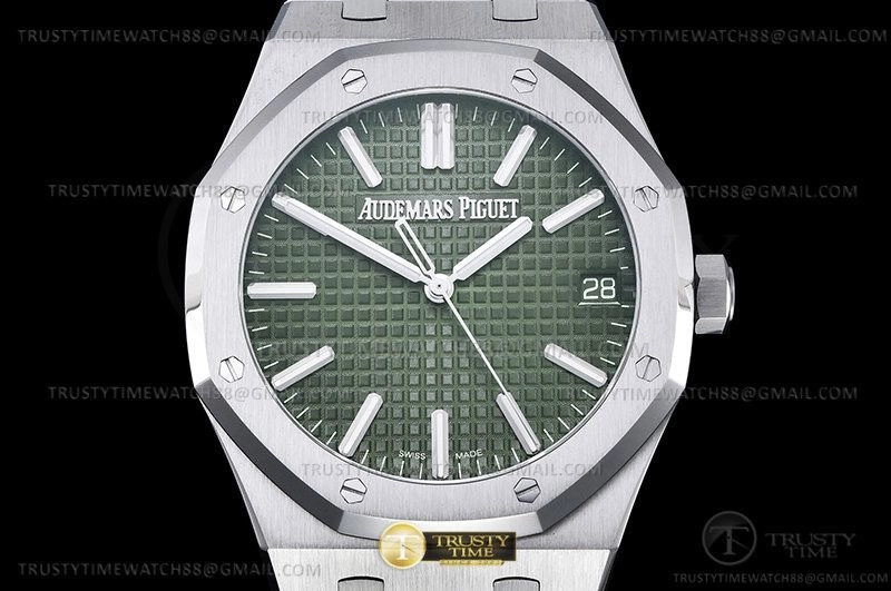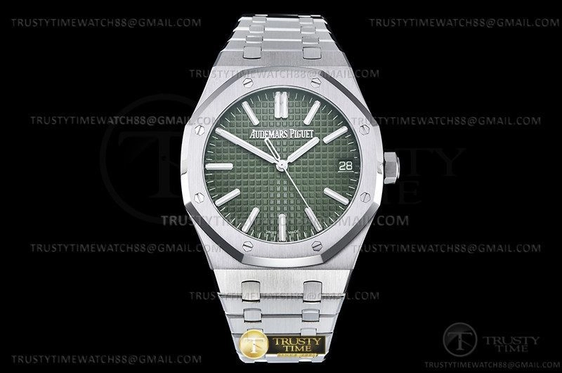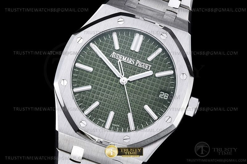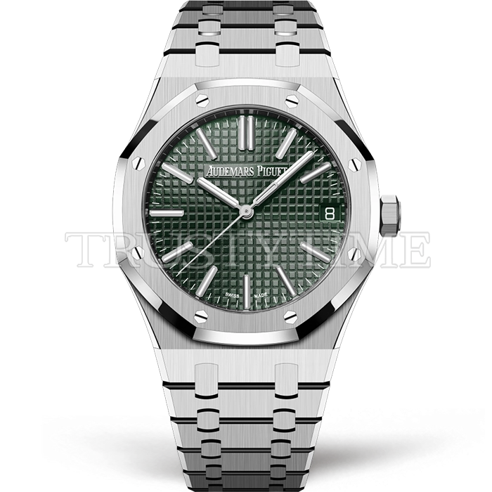 Часы Audemars Piguet из коллекции Royal Oak. Классические мужские часы Audemars Piguet Royal Oak Selfwinding 50th Anniversary 15510ST.OO.1320ST.04 премиального качества (Артикул магазина: AP-1108) оснащены надежным автоматическим механизмом с автоподзаводом (работает от амплитуды движения руки) калибра AP4302, в котором реализованы следующие функции: часовая, минутная и секундная стрелки, а так же дата. Восьмиугольный корпус часов стального цвета, имеющий размер 41 мм и высоту 10 мм превосходно дополнит образ и украсит запястье своего обладателя. Для изготовления часов Audemars Piguet Royal Oak Selfwinding 50th Anniversary 15510ST.OO.1320ST.04 предлагаемых в нашем интернет-магазине, применяются нержавеющая сталь 316F высокого качества (Швейцарский стандарт), а так же сапфировое стекло высокой прочности, благодаря чему обеспечивается максимальная защита от сколов и механических повреждений. Отличительной чертой данной модели является зеленый циферблат, часовые индексы которого обеспечивают часовые метки. Завершает образ браслет из нержавеющей стали стального цвета с фирменной раскладывающейся застежкой Audemars Piguet. Водонепроницаемость данной модели составляет 30М (WR30) – допускается минимальное воздействие с водой.