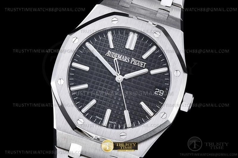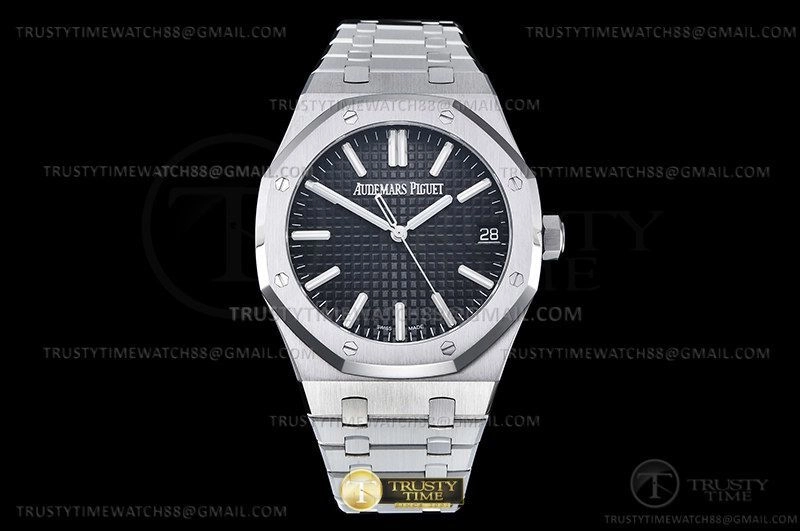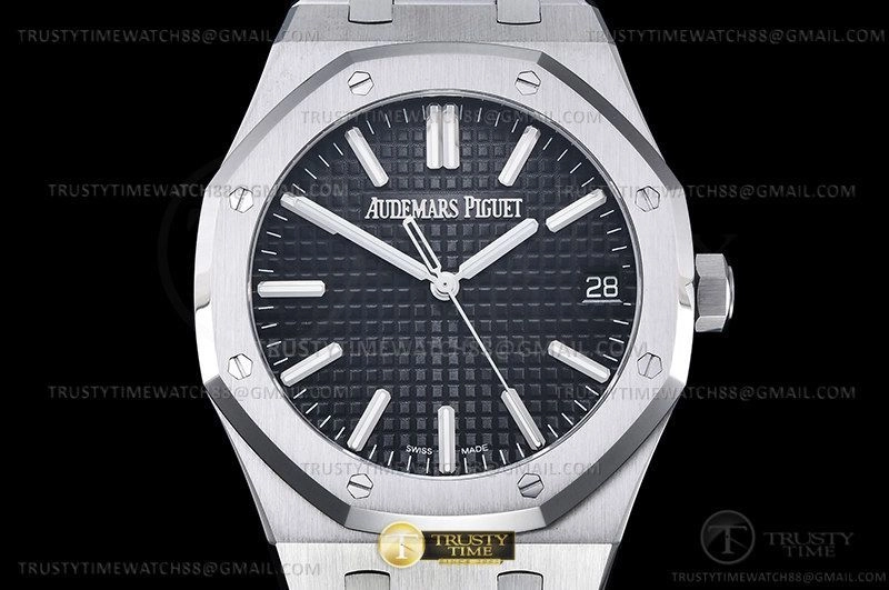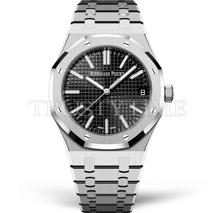 Часы Audemars Piguet из коллекции Royal Oak. Классические мужские часы Audemars Piguet Royal Oak Selfwinding 50th Anniversary 15510ST.OO.1320ST.02 премиального качества (Артикул магазина: AP-1106) оснащены надежным автоматическим механизмом с автоподзаводом (работает от амплитуды движения руки) калибра AP4302, в котором реализованы следующие функции: часовая, минутная и секундная стрелки, а так же дата. Восьмиугольный корпус часов стального цвета, имеющий размер 41 мм и высоту 10 мм превосходно дополнит образ и украсит запястье своего обладателя. Для изготовления часов Audemars Piguet Royal Oak Selfwinding 50th Anniversary 15510ST.OO.1320ST.02 предлагаемых в нашем интернет-магазине, применяются нержавеющая сталь 316F высокого качества (Швейцарский стандарт), а так же сапфировое стекло высокой прочности, благодаря чему обеспечивается максимальная защита от сколов и механических повреждений. Отличительной чертой данной модели является черный циферблат, часовые индексы которого обеспечивают часовые метки. Завершает образ браслет из нержавеющей стали стального цвета с фирменной раскладывающейся застежкой Audemars Piguet. Водонепроницаемость данной модели составляет 30М (WR30) – допускается минимальное воздействие с водой.