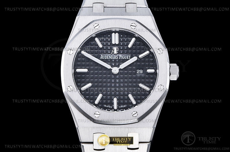Часы Audemars Piguet из коллекции Royal Oak. Классические женские часы Audemars Piguet Royal Oak Ladies 33mm 67650ST.OO.1261ST.01 премиального качества (Артикул магазина: AP-1078) оснащены надежным кварцевым механизмом (работает от батареи) калибра Quartz ETA F04.115, в котором реализованы следующие функции: часовая, минутная и секундная стрелки, а так же дата. Восьмиугольный корпус часов стального цвета, имеющий размер 33 мм и высоту 7.2 мм превосходно дополнит образ и украсит запястье своего обладателя. Для изготовления часов Audemars Piguet Royal Oak Ladies 33mm 67650ST.OO.1261ST.01 предлагаемых в нашем интернет-магазине, применяются нержавеющая сталь 316L высокого качества (Швейцарский стандарт), а так же сапфировое стекло высокой прочности, благодаря чему обеспечивается максимальная защита от сколов и механических повреждений. Отличительной чертой данной модели является черный циферблат, часовые индексы которого обеспечивают часовые метки. Завершает образ браслет из нержавеющей стали стального цвета с фирменной раскладывающейся застежкой Audemars Piguet. Водонепроницаемость данной модели составляет 30М (WR30) – допускается минимальное воздействие с водой.
