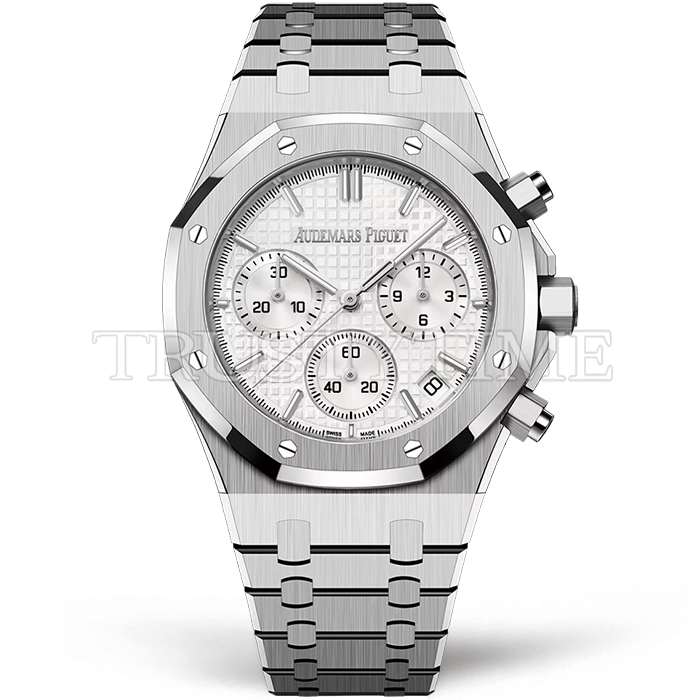Часы Audemars Piguet из коллекции Royal Oak Chronograph. Спортивные мужские часы Audemars Piguet Royal Oak Selfwinding Chronograph 26240ST.OO.1320ST.07 премиального качества (Артикул магазина: AP-1187) оснащены надежным автоматическим механизмом с автоподзаводом (работает от амплитуды движения руки) калибра AP4401, в котором реализованы следующие функции: часовая, минутная и секундная стрелки, а так же дата, хронограф с функцией flyback (мгновенный перезапуск) в наручных часах (chronograph) — это усложнение, которое позволяет мгновенно сбрасывать показания секундомера одним нажатием кнопки. В обычных хронографах для сброса показаний нужно сначала остановить часы, а затем начать заново. Восьмиугольный корпус часов стального цвета, имеющий размер 41 мм и высоту 12.4 мм превосходно дополнит образ и украсит запястье своего обладателя. Для изготовления часов Audemars Piguet Royal Oak Selfwinding Chronograph 26240ST.OO.1320ST.07 предлагаемых в нашем интернет-магазине, применяются нержавеющая сталь 316F высокого качества (Швейцарский стандарт), а так же сапфировое стекло высокой прочности, благодаря чему обеспечивается максимальная защита от сколов и механических повреждений. Отличительной чертой данной модели является белый циферблат, часовые индексы которого обеспечивают часовые метки. Завершает образ браслет из нержавеющей стали стального цвета с фирменной раскладывающейся застежкой Audemars Piguet. Водонепроницаемость данной модели составляет 30М (WR30) – допускается минимальное воздействие с водой.