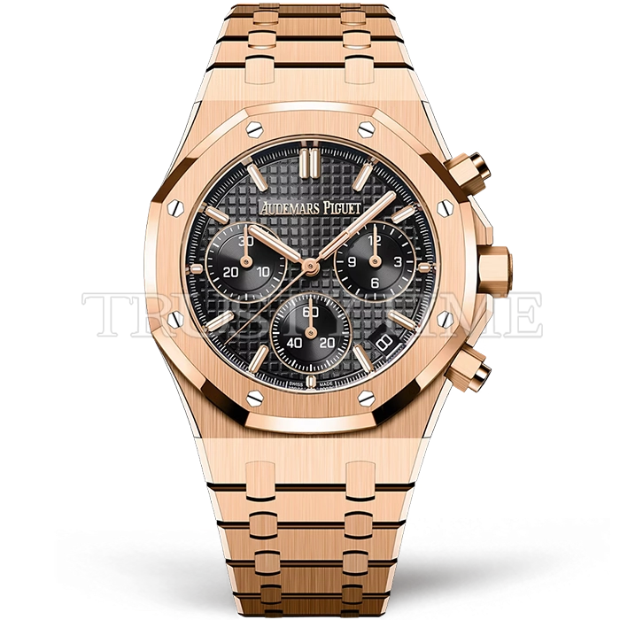 Часы Audemars Piguet из коллекции Royal Oak Chronograph. Спортивные мужские часы Audemars Piguet Royal Oak Selfwinding Chronograph "50th Anniversary" 26240OR.OO.1320OR.02 премиального качества (Артикул магазина: AP-1196) оснащены надежным автоматическим механизмом с автоподзаводом (работает от амплитуды движения руки) калибра AP4401, в котором реализованы следующие функции: часовая, минутная и секундная стрелки, а так же дата, хронограф с функцией flyback (мгновенный перезапуск) в наручных часах (chronograph) — это усложнение, которое позволяет мгновенно сбрасывать показания секундомера одним нажатием кнопки. В обычных хронографах для сброса показаний нужно сначала остановить часы, а затем начать заново. Восьмиугольный корпус часов розового цвета, имеющий размер 41 мм и высоту 12.4 мм превосходно дополнит образ и украсит запястье своего обладателя. Для изготовления часов Audemars Piguet Royal Oak Selfwinding Chronograph "50th Anniversary" 26240OR.OO.1320OR.02 предлагаемых в нашем интернет-магазине, применяются нержавеющая сталь 316F высокого качества (Швейцарский стандарт), а так же сапфировое стекло высокой прочности, благодаря чему обеспечивается максимальная защита от сколов и механических повреждений. Отличительной чертой данной модели является черный циферблат, часовые индексы которого обеспечивают часовые метки. Завершает образ браслет из нержавеющей стали цвета розового золота с фирменной раскладывающейся застежкой Audemars Piguet. Водонепроницаемость данной модели составляет 30М (WR30) – допускается минимальное воздействие с водой.