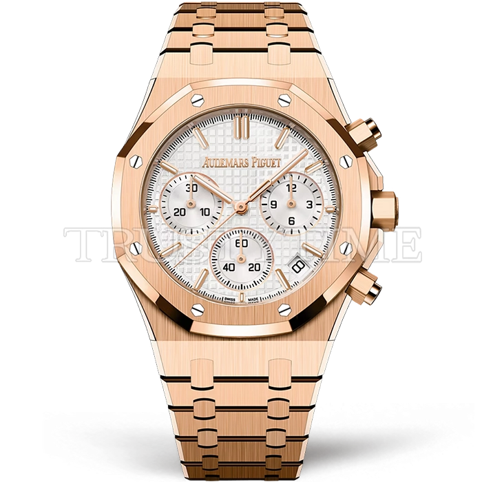 Часы Audemars Piguet из коллекции Royal Oak Chronograph. Спортивные мужские часы Audemars Piguet Royal Oak Selfwinding Chronograph "50th Anniversary" 26240OR.OO.1320OR.03 премиального качества (Артикул магазина: AP-1195) оснащены надежным автоматическим механизмом с автоподзаводом (работает от амплитуды движения руки) калибра AP4401, в котором реализованы следующие функции: часовая, минутная и секундная стрелки, а так же дата, хронограф с функцией flyback (мгновенный перезапуск) в наручных часах (chronograph) — это усложнение, которое позволяет мгновенно сбрасывать показания секундомера одним нажатием кнопки. В обычных хронографах для сброса показаний нужно сначала остановить часы, а затем начать заново. Восьмиугольный корпус часов розового цвета, имеющий размер 41 мм и высоту 12.4 мм превосходно дополнит образ и украсит запястье своего обладателя. Для изготовления часов Audemars Piguet Royal Oak Selfwinding Chronograph "50th Anniversary" 26240OR.OO.1320OR.03 предлагаемых в нашем интернет-магазине, применяются нержавеющая сталь 316F высокого качества (Швейцарский стандарт), а так же сапфировое стекло высокой прочности, благодаря чему обеспечивается максимальная защита от сколов и механических повреждений. Отличительной чертой данной модели является белый циферблат, часовые индексы которого обеспечивают часовые метки. Завершает образ браслет из нержавеющей стали цвета розового золота с фирменной раскладывающейся застежкой Audemars Piguet. Водонепроницаемость данной модели составляет 30М (WR30) – допускается минимальное воздействие с водой.
