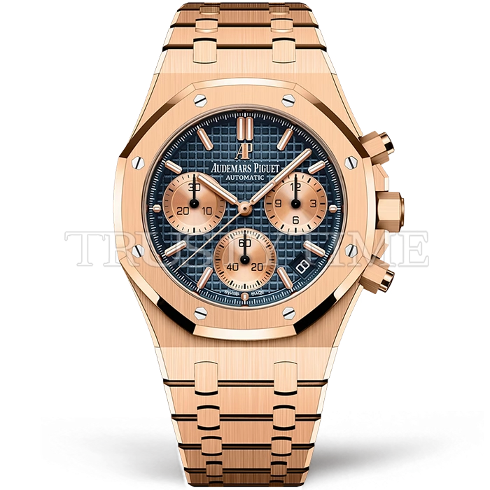 Часы Audemars Piguet из коллекции Royal Oak Chronograph. Спортивные мужские часы Audemars Piguet Royal Oak Selfwinding Chronograph 26239OR.OO.1220OR.01 премиального качества (Артикул магазина: AP-1203) оснащены надежным автоматическим механизмом с автоподзаводом (работает от амплитуды движения руки) калибра AP4401, в котором реализованы следующие функции: часовая, минутная и секундная стрелки, а так же дата, хронограф с функцией flyback (мгновенный перезапуск) в наручных часах (chronograph) — это усложнение, которое позволяет мгновенно сбрасывать показания секундомера одним нажатием кнопки. В обычных хронографах для сброса показаний нужно сначала остановить часы, а затем начать заново. Восьмиугольный корпус часов розового цвета, имеющий размер 41 мм и высоту 12.4 мм превосходно дополнит образ и украсит запястье своего обладателя. Для изготовления часов Audemars Piguet Royal Oak Selfwinding Chronograph 26239OR.OO.1220OR.01 предлагаемых в нашем интернет-магазине, применяются нержавеющая сталь 316F высокого качества (Швейцарский стандарт), а так же сапфировое стекло высокой прочности, благодаря чему обеспечивается максимальная защита от сколов и механических повреждений. Отличительной чертой данной модели является синий циферблат, часовые индексы которого обеспечивают часовые метки. Завершает образ браслет из нержавеющей стали цвета розового золота с фирменной раскладывающейся застежкой Audemars Piguet. Водонепроницаемость данной модели составляет 30М (WR30) – допускается минимальное воздействие с водой.