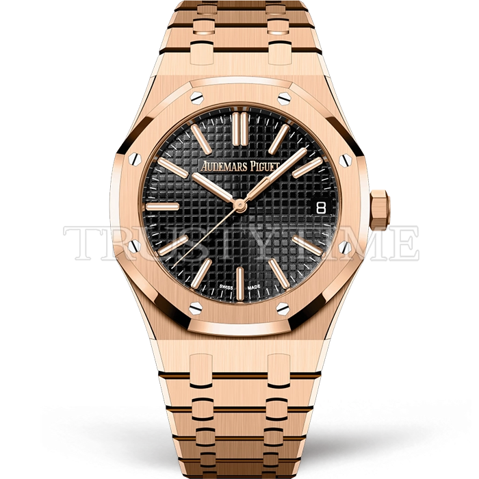 Часы Audemars Piguet из коллекции Royal Oak. Классические мужские часы Audemars Piguet Royal Oak Selfwinding 15510OR.OO.1320OR.04 премиального качества (Артикул магазина: AP-1216) оснащены надежным автоматическим механизмом с автоподзаводом (работает от амплитуды движения руки) калибра AP4302, в котором реализованы следующие функции: часовая, минутная и секундная стрелки, а так же дата. Восьмиугольный корпус часов розового цвета, имеющий размер 41 мм и высоту 10.5 мм превосходно дополнит образ и украсит запястье своего обладателя. Для изготовления часов Audemars Piguet Royal Oak Selfwinding 15510OR.OO.1320OR.04 предлагаемых в нашем интернет-магазине, применяются нержавеющая сталь 316F высокого качества (Швейцарский стандарт), а так же сапфировое стекло высокой прочности, благодаря чему обеспечивается максимальная защита от сколов и механических повреждений. Отличительной чертой данной модели является черный циферблат, часовые индексы которого обеспечивают часовые метки. Завершает образ браслет из нержавеющей стали цвета розового золота с фирменной раскладывающейся застежкой Audemars Piguet. Водонепроницаемость данной модели составляет 30М (WR30) – допускается минимальное воздействие с водой.
