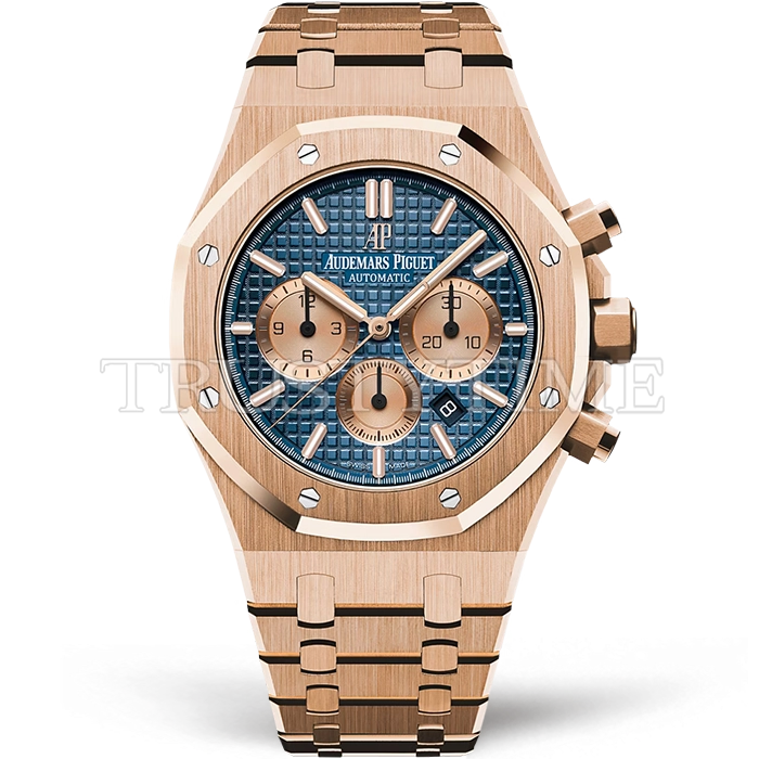 Часы Audemars Piguet из коллекции Royal Oak Chronograph. Спортивные мужские часы Audemars Piguet Royal Oak Selfwinding Chronograph 26331OR.OO.1220OR.01 премиального качества (Артикул магазина: AP-1231) оснащены надежным автоматическим механизмом с автоподзаводом (работает от амплитуды движения руки) калибра AP2385, в котором реализованы следующие функции: часовая, минутная и секундная стрелки, а так же дата, хронограф с функцией flyback (мгновенный перезапуск) в наручных часах (chronograph) — это усложнение, которое позволяет мгновенно сбрасывать показания секундомера одним нажатием кнопки. В обычных хронографах для сброса показаний нужно сначала остановить часы, а затем начать заново. Восьмиугольный корпус часов розового цвета, имеющий размер 41 мм и высоту 11 мм превосходно дополнит образ и украсит запястье своего обладателя. Для изготовления часов Audemars Piguet Royal Oak Selfwinding Chronograph 26331OR.OO.1220OR.01 предлагаемых в нашем интернет-магазине, применяются нержавеющая сталь 316F высокого качества (Швейцарский стандарт), а так же сапфировое стекло высокой прочности, благодаря чему обеспечивается максимальная защита от сколов и механических повреждений. Отличительной чертой данной модели является синий циферблат, часовые индексы которого обеспечивают часовые метки. Завершает образ браслет из нержавеющей стали цвета розового золота с фирменной раскладывающейся застежкой Audemars Piguet. Водонепроницаемость данной модели составляет 30М (WR30) – допускается минимальное воздействие с водой.