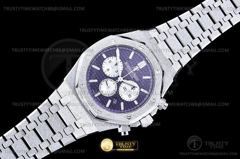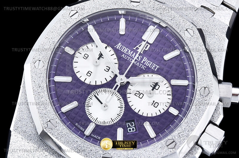 Часы Audemars Piguet из коллекции Royal Oak Chronograph. Спортивные мужские часы Audemars Piguet Royal Oak Frosted Gold Selfwinding Chronograph 26331BC.GG.1224BC.01 премиального качества (Артикул магазина: AP-1238) оснащены надежным автоматическим механизмом с автоподзаводом (работает от амплитуды движения руки) калибра AP2385, в котором реализованы следующие функции: часовая, минутная и секундная стрелки, а так же дата, хронограф с функцией flyback (мгновенный перезапуск) в наручных часах (chronograph) — это усложнение, которое позволяет мгновенно сбрасывать показания секундомера одним нажатием кнопки. В обычных хронографах для сброса показаний нужно сначала остановить часы, а затем начать заново. Восьмиугольный корпус часов розового цвета, имеющий размер 41 мм и высоту 11 мм превосходно дополнит образ и украсит запястье своего обладателя. Для изготовления часов Audemars Piguet Royal Oak Frosted Gold Selfwinding Chronograph 26331BC.GG.1224BC.01 предлагаемых в нашем интернет-магазине, применяются каменистая сталь 316F высокого качества (Швейцарский стандарт), а так же сапфировое стекло высокой прочности, благодаря чему обеспечивается максимальная защита от сколов и механических повреждений. Отличительной чертой данной модели является фиолетовый циферблат, часовые индексы которого обеспечивают часовые метки. Завершает образ браслет из нержавеющей стали каменистой фактуры стального цвета с фирменной раскладывающейся застежкой Audemars Piguet. Водонепроницаемость данной модели составляет 30М (WR30) – допускается минимальное воздействие с водой.