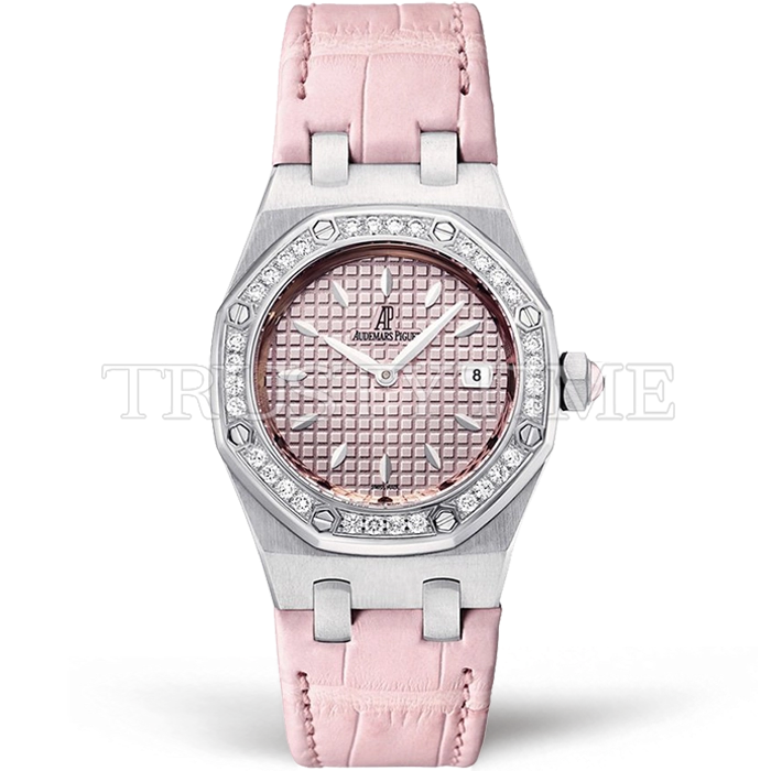 Часы Audemars Piguet из коллекции Royal Oak. Классические женские часы Audemars Piguet Royal Oak Ladies 33mm 67601ST.ZZ.D057CR.01 премиального качества (Артикул магазина: AP-1075) оснащены надежным кварцевым механизмом (работает от батареи) калибра Swiss Quartz ETA, в котором реализованы следующие функции: часова и минутка стрелки, а так же дата. Восьмиугольный корпус часов стального цвета, имеющий размер 33 мм и высоту 9.2 мм превосходно дополнит образ и украсит запястье своего обладателя. Для изготовления часов Audemars Piguet Royal Oak Ladies 33mm 67601ST.ZZ.D057CR.01 предлагаемых в нашем интернет-магазине, применяются нержавеющая сталь 316L высокого качества (Швейцарский стандарт), а так же сапфировое стекло высокой прочности, благодаря чему обеспечивается максимальная защита от сколов и механических повреждений. Отличительной чертой данной модели является розовый циферблат, часовые индексы которого обеспечивают часовые метки. Завершает образ кожаный ремешок розового цвета с фирменной классической застежкой Audemars Piguet. Водонепроницаемость данной модели составляет 30М (WR30) – допускается минимальное воздействие с водой.