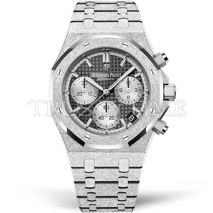 Часы Audemars Piguet из коллекции Royal Oak Chronograph. Спортивные мужские часы Audemars Piguet Royal Oak Frosted Gold Selfwinding Chronograph 26239BC.GG.1224BC.02 премиального качества (Артикул магазина: AP-1205) оснащены надежным автоматическим механизмом с автоподзаводом (работает от амплитуды движения руки) калибра AP4401, в котором реализованы следующие функции: часовая, минутная и секундная стрелки, а так же дата, хронограф с функцией flyback (мгновенный перезапуск) в наручных часах (chronograph) — это усложнение, которое позволяет мгновенно сбрасывать показания секундомера одним нажатием кнопки. В обычных хронографах для сброса показаний нужно сначала остановить часы, а затем начать заново. Восьмиугольный корпус часов стального цвета, имеющий размер 41 мм и высоту 12.4 мм превосходно дополнит образ и украсит запястье своего обладателя. Для изготовления часов Audemars Piguet Royal Oak Frosted Gold Selfwinding Chronograph 26239BC.GG.1224BC.02 предлагаемых в нашем интернет-магазине, применяются каменистая сталь 316F высокого качества (Швейцарский стандарт), а так же сапфировое стекло высокой прочности, благодаря чему обеспечивается максимальная защита от сколов и механических повреждений. Отличительной чертой данной модели является серый циферблат, часовые индексы которого обеспечивают часовые метки. Завершает образ браслет из нержавеющей стали каменистой фактуры стального цвета с фирменной раскладывающейся застежкой Audemars Piguet. Водонепроницаемость данной модели составляет 30М (WR30) – допускается минимальное воздействие с водой.