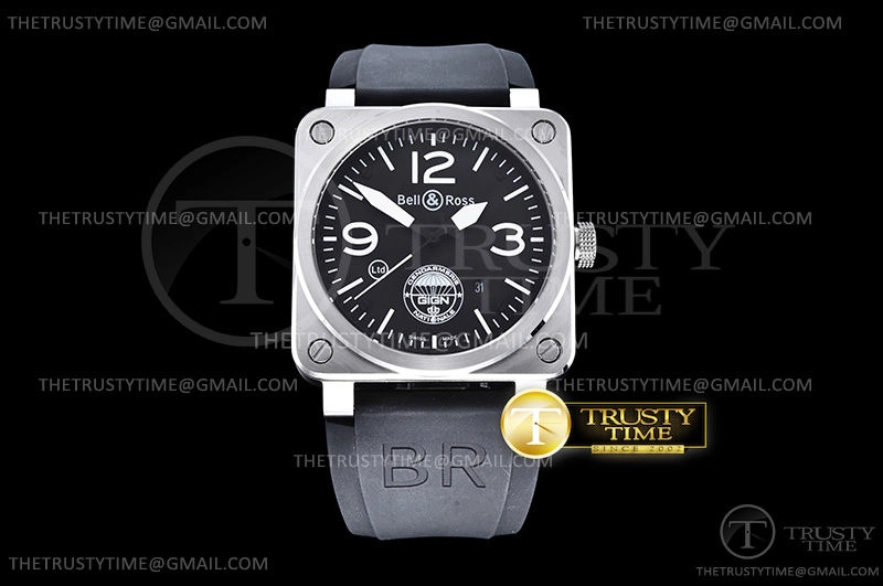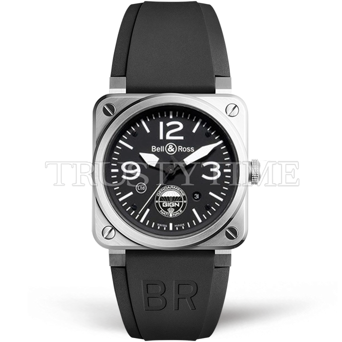 Часы Bell & Ross из коллекции BR 03-92. Классические мужские часы Bell & Ross BR 03-92 GIGN Limited Edition премиального качества (Артикул магазина: BR-0227) оснащены надежным автоматическим механизмом с автоподзаводом (работает от амплитуды движения руки) калибра MY9015, в котором реализованы следующие функции: часовая, минутная и секундная стрелки, а так же дата. Квадратный корпус часов стального цвета, имеющий размер 42 мм X 42 мм и высоту 11 мм превосходно дополнит образ и украсит запястье своего обладателя. Для изготовления часов Bell & Ross BR 03-92 GIGN Limited Edition предлагаемых в нашем интернет-магазине, применяются нержавеющая сталь 316L высокого качества (Швейцарский стандарт), а так же сапфировое стекло высокой прочности, благодаря чему обеспечивается максимальная защита от сколов и механических повреждений. Отличительной чертой данной модели является черный циферблат, часовые индексы которого обеспечивают часовые метки. Завершает образ каучуковый ремешок черного цвета с фирменной классической застежкой Bell & Ross. Водонепроницаемость данной модели составляет 30М (WR30) – допускается минимальное воздействие с водой.
