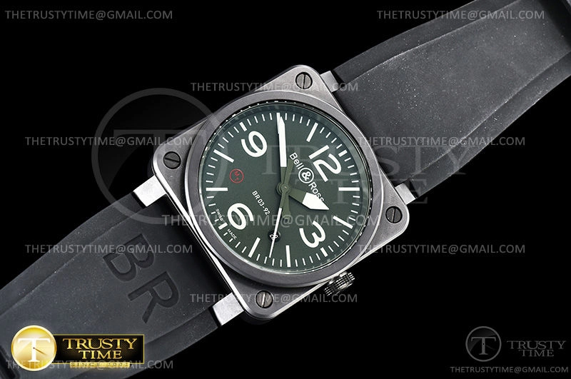 Часы Bell & Ross из коллекции BR 03-92. Классические мужские часы Bell & Ross BR 03-92 Military Type BR0392-MIL-CE премиального качества (Артикул магазина: BR-0208) оснащены надежным автоматическим механизмом с автоподзаводом (работает от амплитуды движения руки) калибра MY9015, в котором реализованы следующие функции: часовая, минутная и секундная стрелки, а так же дата. Квадратный корпус часов черного цвета, имеющий размер 42 мм X 42 мм и высоту 11 мм превосходно дополнит образ и украсит запястье своего обладателя. Для изготовления часов Bell & Ross BR 03-92 Military Type BR0392-MIL-CE предлагаемых в нашем интернет-магазине, применяются керамика высокого качества (Швейцарский стандарт), а так же сапфировое стекло высокой прочности, благодаря чему обеспечивается максимальная защита от сколов и механических повреждений. Отличительной чертой данной модели является зеленый циферблат, часовые индексы которого обеспечивают часовые метки. Завершает образ каучуковый ремешок черного цвета с фирменной классической застежкой Bell & Ross. Водонепроницаемость данной модели составляет 30М (WR30) – допускается минимальное воздействие с водой.