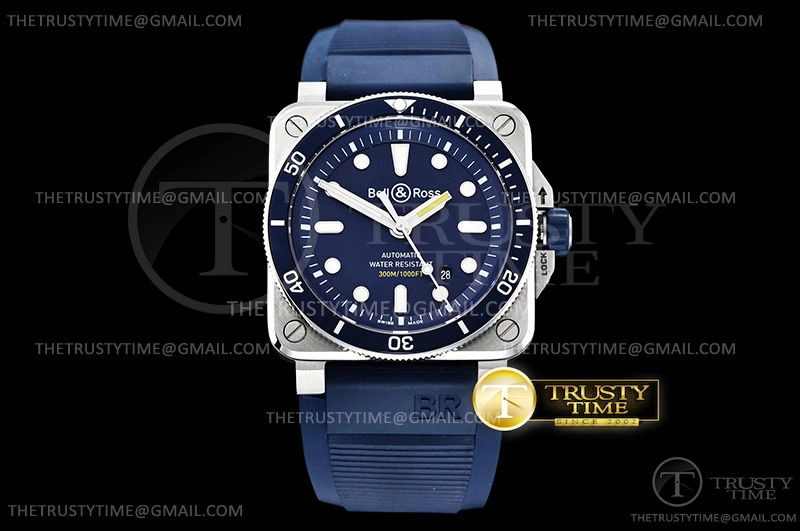 Часы Bell & Ross из коллекции BR 03-92. Классические мужские часы Bell & Ross BR 03-92 Diver Blue BR0392-D-BU-ST/SRB премиального качества (Артикул магазина: BR-0206) оснащены надежным автоматическим механизмом с автоподзаводом (работает от амплитуды движения руки) калибра MY9015, в котором реализованы следующие функции: часовая, минутная и секундная стрелки, а так же дата. Квадратный корпус часов стального цвета, имеющий размер 42 мм X 42 мм и высоту 11 мм превосходно дополнит образ и украсит запястье своего обладателя. Для изготовления часов Bell & Ross BR 03-92 Diver Blue BR0392-D-BU-ST/SRB предлагаемых в нашем интернет-магазине, применяются нержавеющая сталь 316L высокого качества (Швейцарский стандарт), а так же сапфировое стекло высокой прочности, благодаря чему обеспечивается максимальная защита от сколов и механических повреждений. Отличительной чертой данной модели является синий циферблат, часовые индексы которого обеспечивают часовые метки. Завершает образ каучуковый ремешок синего цвета с фирменной классической застежкой Bell & Ross. Водонепроницаемость данной модели составляет 30М (WR30) – допускается минимальное воздействие с водой.