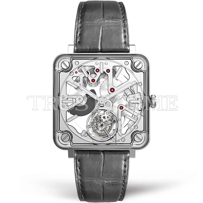 Часы Bell & Ross из коллекции BR X-2. Классические мужские часы Bell & Ross Experimental Tourbillon BRX2-MRTB-SK-ST премиального качества (Артикул магазина: BR-0306) оснащены надежным автоматическим механизмом с ручным заводом калибра BR-380, в котором реализованы следующие функции: часова и минутка стрелки, а так же турбийон. Квадратный корпус часов стального цвета, имеющий размер 42.5 мм X 42.5 мм и высоту 12.5 мм превосходно дополнит образ и украсит запястье своего обладателя. Для изготовления часов Bell & Ross Experimental Tourbillon BRX2-MRTB-SK-ST предлагаемых в нашем интернет-магазине, применяются нержавеющая сталь 316L высокого качества (Швейцарский стандарт), а так же сапфировое стекло высокой прочности, благодаря чему обеспечивается максимальная защита от сколов и механических повреждений. Отличительной чертой данной модели является серебристый циферблат, часовые индексы которого обеспечивают часовые метки. Завершает образ кожаный ремешок серого цвета с фирменной классической застежкой Bell & Ross. Водонепроницаемость данной модели составляет 30М (WR30) – допускается минимальное воздействие с водой.