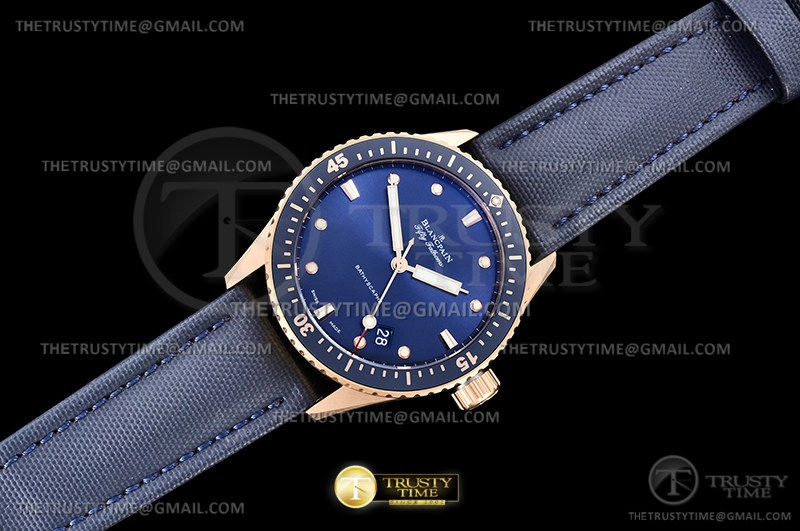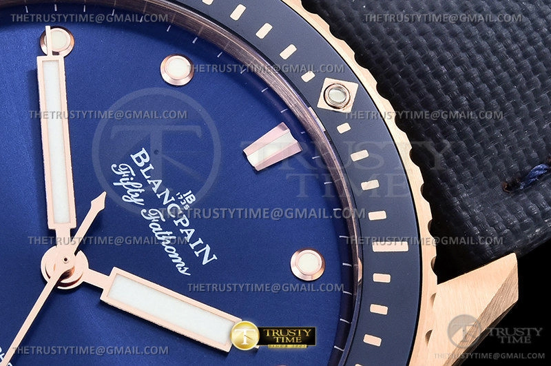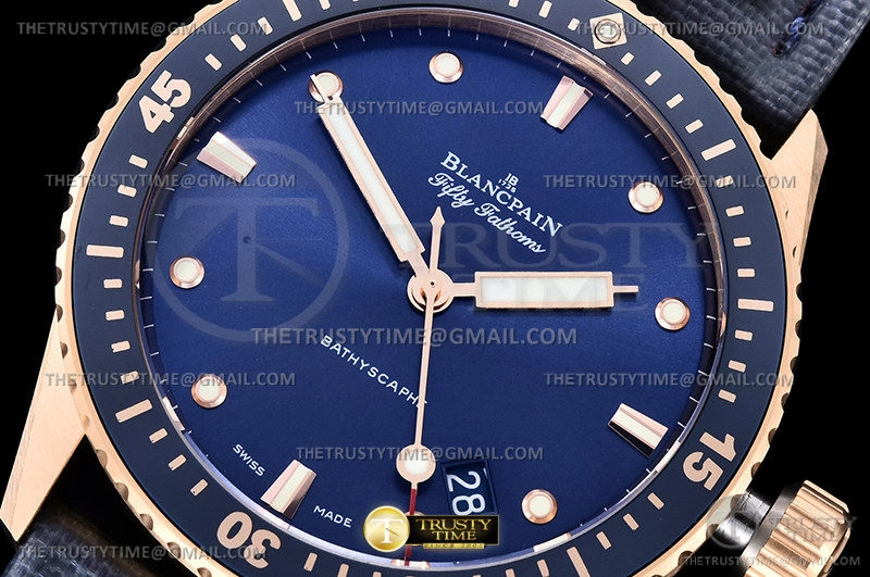 Часы Blancpain из коллекции Fifty Fathoms Bathyscaphe. Классические мужские часы Blancpain Fifty Fathoms Bathyscaphe 5000-36S40-O52A премиального качества (Артикул магазина: BP-0345) оснащены надежным автоматическим механизмом с автоподзаводом (работает от амплитуды движения руки) калибра BP1315, в котором реализованы следующие функции: часовая, минутная и секундная стрелки, а так же дата. Круглый корпус часов розового цвета, имеющий размер 45 мм и высоту 13.5 мм превосходно дополнит образ и украсит запястье своего обладателя. Для изготовления часов Blancpain Fifty Fathoms Bathyscaphe 5000-36S40-O52A предлагаемых в нашем интернет-магазине, применяются нержавеющая сталь 316F высокого качества (Швейцарский стандарт), а так же сапфировое стекло высокой прочности, благодаря чему обеспечивается максимальная защита от сколов и механических повреждений. Отличительной чертой данной модели является синий циферблат, часовые индексы которого обеспечивают часовые метки. Завершает образ нейлоновый ремешок синего цвета с фирменной классической застежкой Blancpain. Водонепроницаемость данной модели составляет 30М (WR30) – допускается минимальное воздействие с водой.