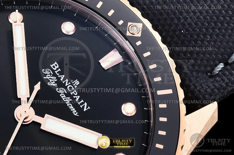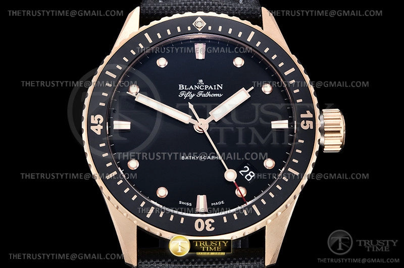 Часы Blancpain из коллекции Fifty Fathoms Bathyscaphe. Классические мужские часы Blancpain Fifty Fathoms Bathyscaphe 5000-36S30-B52A премиального качества (Артикул магазина: BP-0346) оснащены надежным автоматическим механизмом с автоподзаводом (работает от амплитуды движения руки) калибра BP1315, в котором реализованы следующие функции: часовая, минутная и секундная стрелки, а так же дата. Круглый корпус часов розового цвета, имеющий размер 45 мм и высоту 13.5 мм превосходно дополнит образ и украсит запястье своего обладателя. Для изготовления часов Blancpain Fifty Fathoms Bathyscaphe 5000-36S30-B52A предлагаемых в нашем интернет-магазине, применяются нержавеющая сталь 316F высокого качества (Швейцарский стандарт), а так же сапфировое стекло высокой прочности, благодаря чему обеспечивается максимальная защита от сколов и механических повреждений. Отличительной чертой данной модели является черный циферблат, часовые индексы которого обеспечивают часовые метки. Завершает образ нейлоновый ремешок черного цвета с фирменной классической застежкой Blancpain. Водонепроницаемость данной модели составляет 30М (WR30) – допускается минимальное воздействие с водой.