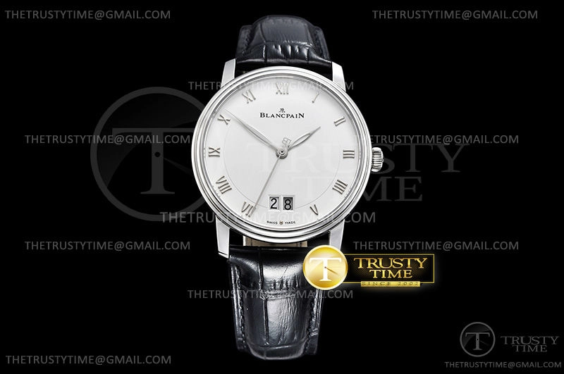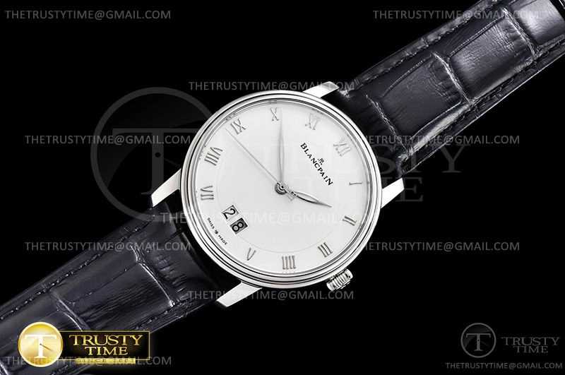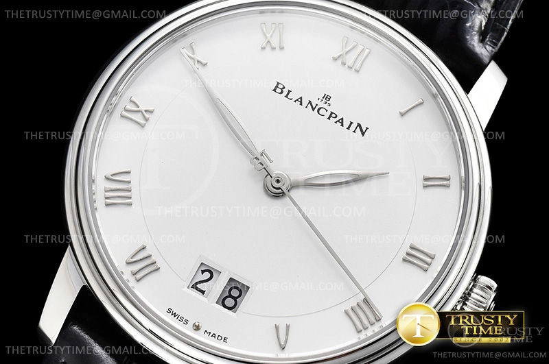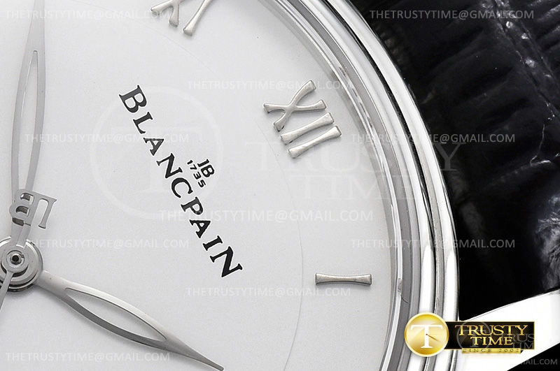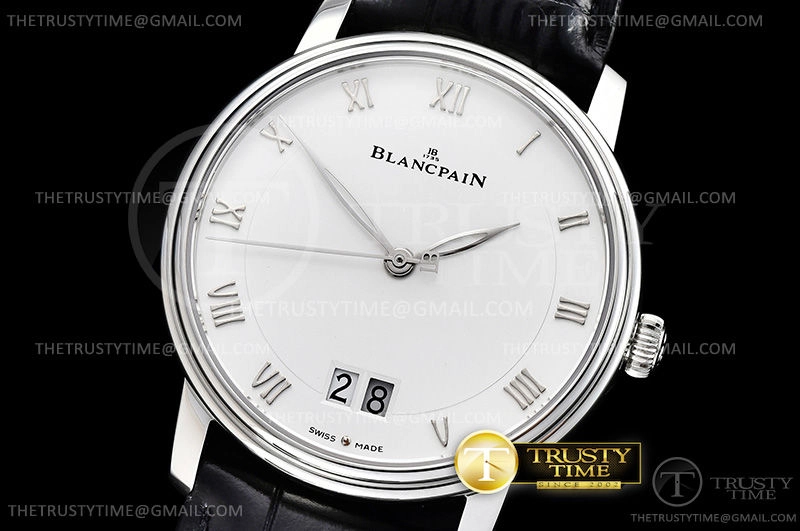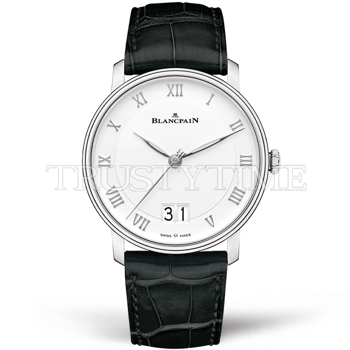 Часы Blancpain из коллекции Villeret Grande. Классические мужские часы Blancpain Villeret Grande Date 6669-1127-55B премиального качества (Артикул магазина: BP-0334) оснащены надежным автоматическим механизмом с автоподзаводом (работает от амплитуды движения руки) калибра BP6950, в котором реализованы следующие функции: часовая, минутная и секундная стрелки, а так же дата. Круглый корпус часов стального цвета, имеющий размер 40 мм и высоту 12.5 мм превосходно дополнит образ и украсит запястье своего обладателя. Для изготовления часов Blancpain Villeret Grande Date 6669-1127-55B предлагаемых в нашем интернет-магазине, применяются нержавеющая сталь 316L высокого качества (Швейцарский стандарт), а так же сапфировое стекло высокой прочности, благодаря чему обеспечивается максимальная защита от сколов и механических повреждений. Отличительной чертой данной модели является белый циферблат, часовые индексы которого обеспечивают римские цифры. Завершает образ кожаный ремешок черного цвета с фирменной раскладывающейся застежкой Blancpain. Водонепроницаемость данной модели составляет 30М (WR30) – допускается минимальное воздействие с водой.