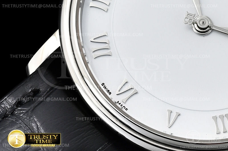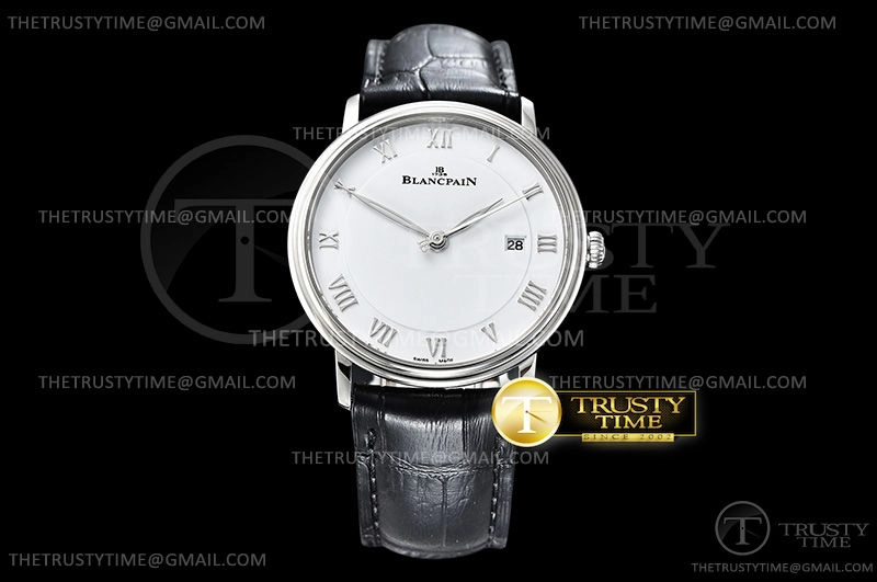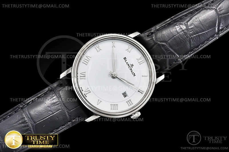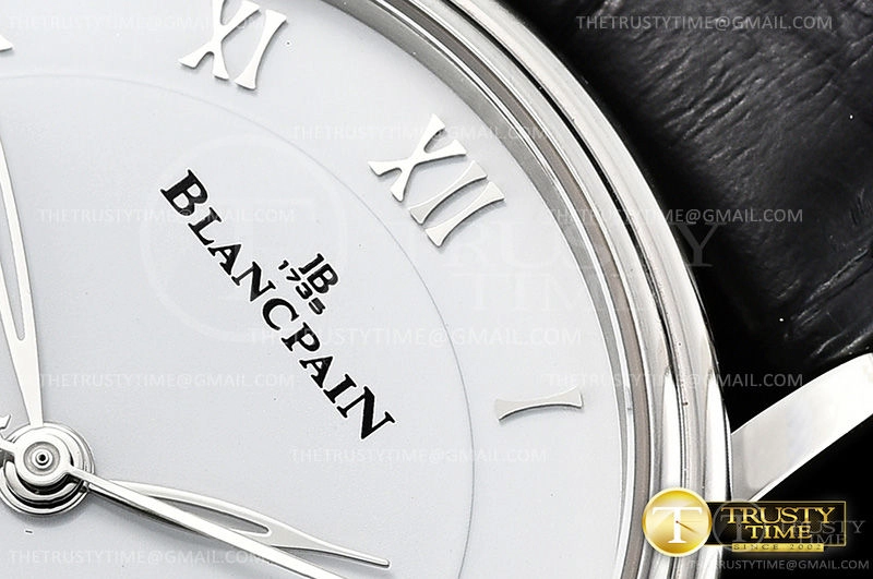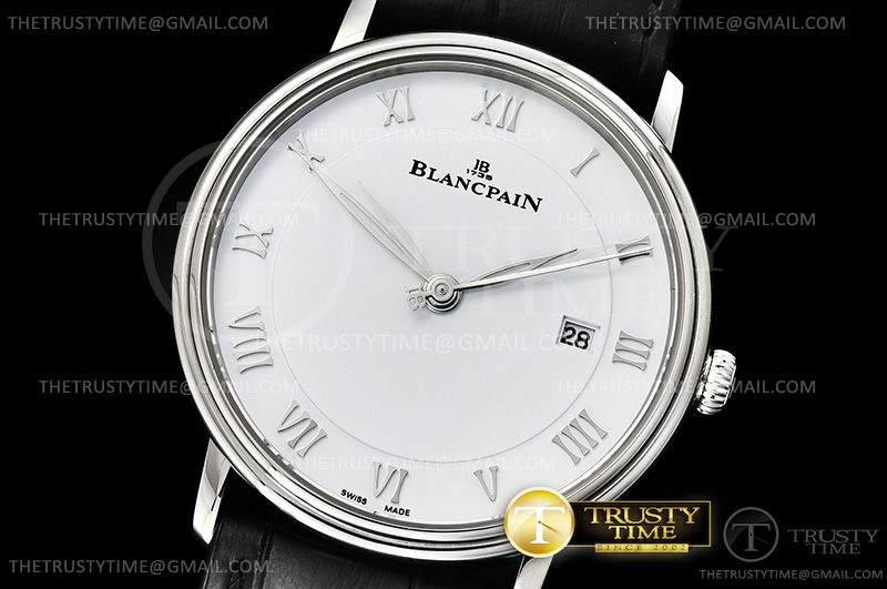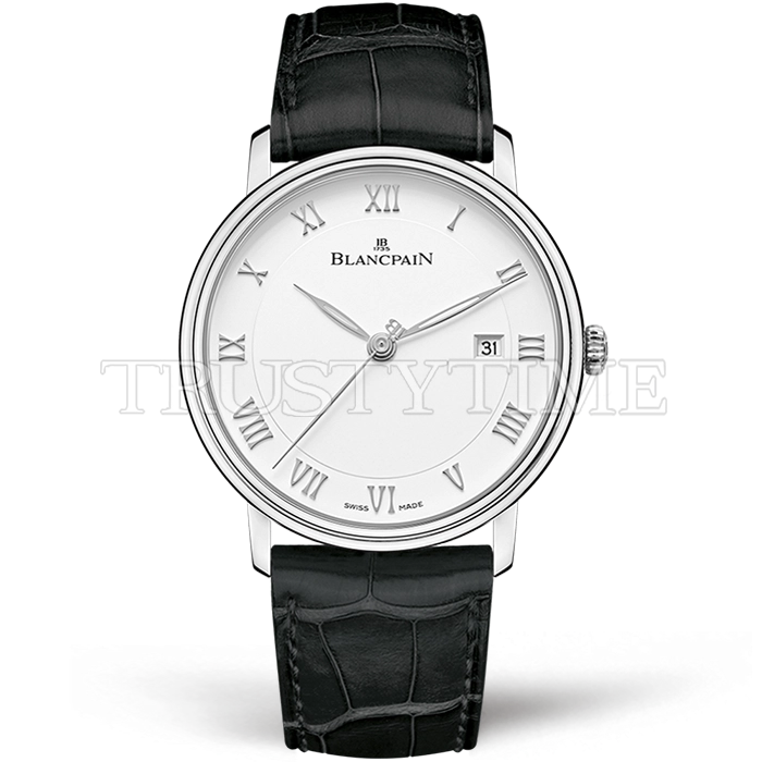 Часы Blancpain из коллекции Villeret. Классические мужские часы Blancpain Villeret Ultra-Slim 6651-1127-55B премиального качества (Артикул магазина: BP-0317) оснащены надежным автоматическим механизмом с автоподзаводом (работает от амплитуды движения руки) калибра BP1151, в котором реализованы следующие функции: часовая, минутная и секундная стрелки, а так же дата. Круглый корпус часов стального цвета, имеющий размер 40 мм и высоту 9 мм превосходно дополнит образ и украсит запястье своего обладателя. Для изготовления часов Blancpain Villeret Ultra-Slim 6651-1127-55B предлагаемых в нашем интернет-магазине, применяются нержавеющая сталь 316L высокого качества (Швейцарский стандарт), а так же сапфировое стекло высокой прочности, благодаря чему обеспечивается максимальная защита от сколов и механических повреждений. Отличительной чертой данной модели является белый циферблат, часовые индексы которого обеспечивают римские цифры. Завершает образ кожаный ремешок черного цвета с фирменной раскладывающейся застежкой Blancpain. Водонепроницаемость данной модели составляет 30М (WR30) – допускается минимальное воздействие с водой.