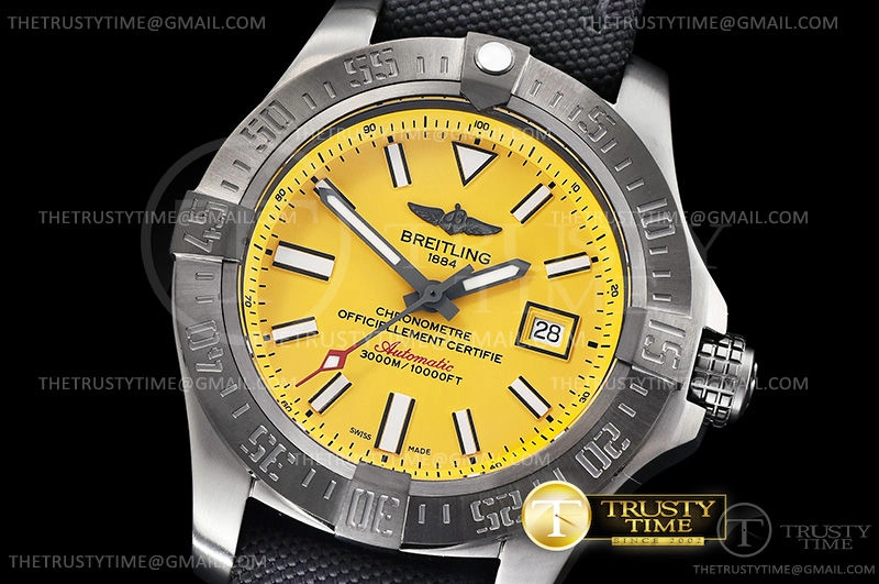 Часы Breitling из коллекции Avenger II. Классические мужские часы Breitling Avenger Blackbird Limited Edition 45 V173104T|I524|100W|M20BASA.1 премиального качества (Артикул магазина: BT-0341) оснащены надежным автоматическим механизмом с автоподзаводом (работает от амплитуды движения руки) калибра ETA2836-2, в котором реализованы следующие функции: часовая, минутная и секундная стрелки, а так же дата. Круглый корпус часов черного цвета, имеющий размер 45 мм и высоту 18 мм превосходно дополнит образ и украсит запястье своего обладателя. Для изготовления часов Breitling Avenger Blackbird Limited Edition 45 V173104T|I524|100W|M20BASA.1 предлагаемых в нашем интернет-магазине, применяются нержавеющая сталь 316F высокого качества (Швейцарский стандарт), а так же сапфировое стекло высокой прочности, благодаря чему обеспечивается максимальная защита от сколов и механических повреждений. Отличительной чертой данной модели является желтый циферблат, часовые индексы которого обеспечивают часовые метки. Завершает образ нейлоновый ремешок черного цвета с фирменной классической застежкой Breitling. Водонепроницаемость данной модели составляет 30М (WR30) – допускается минимальное воздействие с водой.
