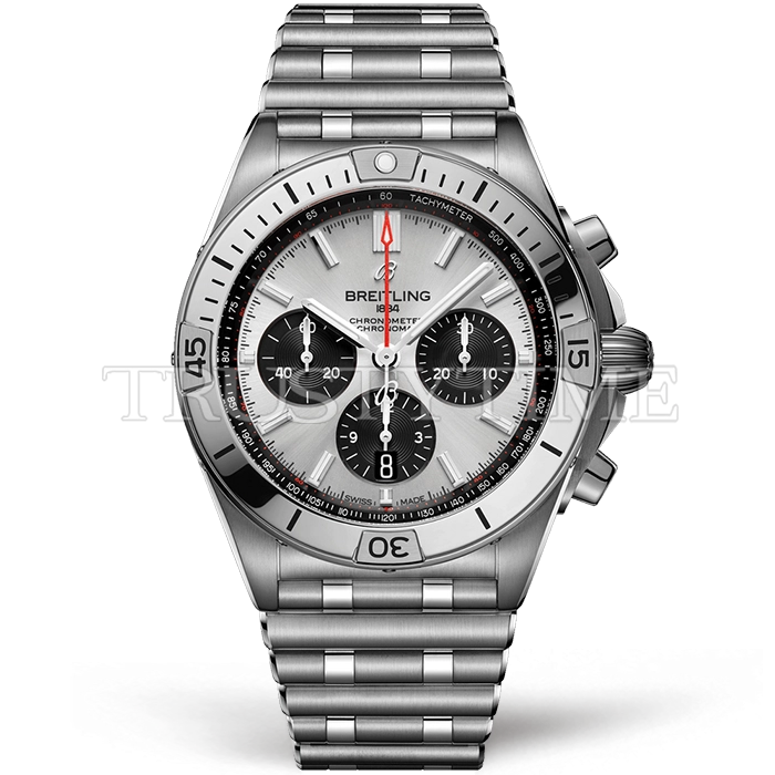 Часы Breitling из коллекции Chronomat B01 42. Спортивные мужские часы Breitling Chronomat B01 42 AB0134101G1A1 премиального качества (Артикул магазина: BT-0587) оснащены надежным автоматическим механизмом с автоподзаводом (работает от амплитуды движения руки) калибра Valjoux-7750, в котором реализованы следующие функции: часовая, минутная и секундная стрелки, а так же хронограф, дата. Круглый корпус часов стального цвета, имеющий размер 42 мм и высоту 14.5 мм превосходно дополнит образ и украсит запястье своего обладателя. Для изготовления часов Breitling Chronomat B01 42 AB0134101G1A1 предлагаемых в нашем интернет-магазине, применяются нержавеющая сталь 316F высокого качества (Швейцарский стандарт), а так же сапфировое стекло высокой прочности, благодаря чему обеспечивается максимальная защита от сколов и механических повреждений. Отличительной чертой данной модели является серебристый циферблат, часовые индексы которого обеспечивают часовые метки. Завершает образ браслет из нержавеющей стали стального цвета с фирменной раскладывающейся застежкой Breitling. Водонепроницаемость данной модели составляет 30М (WR30) – допускается минимальное воздействие с водой.