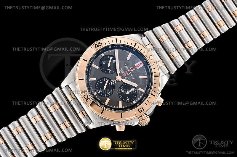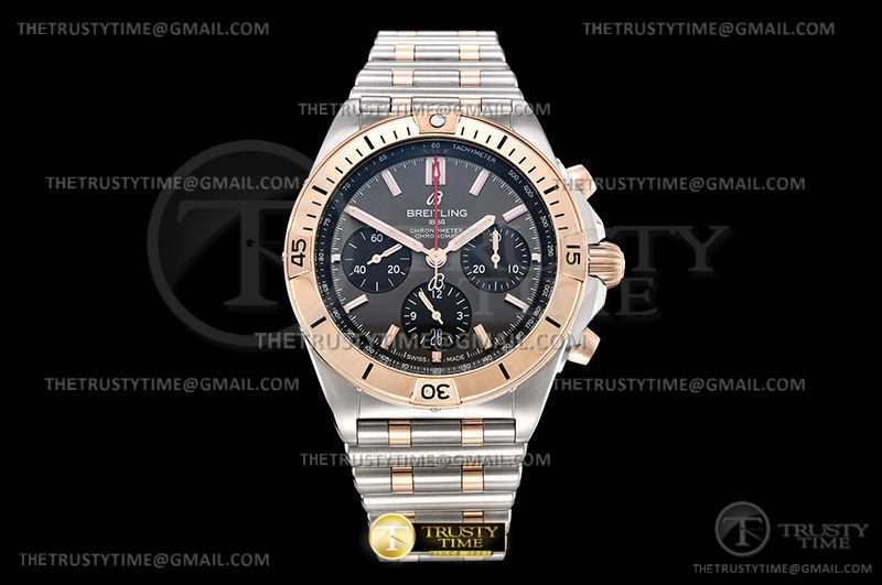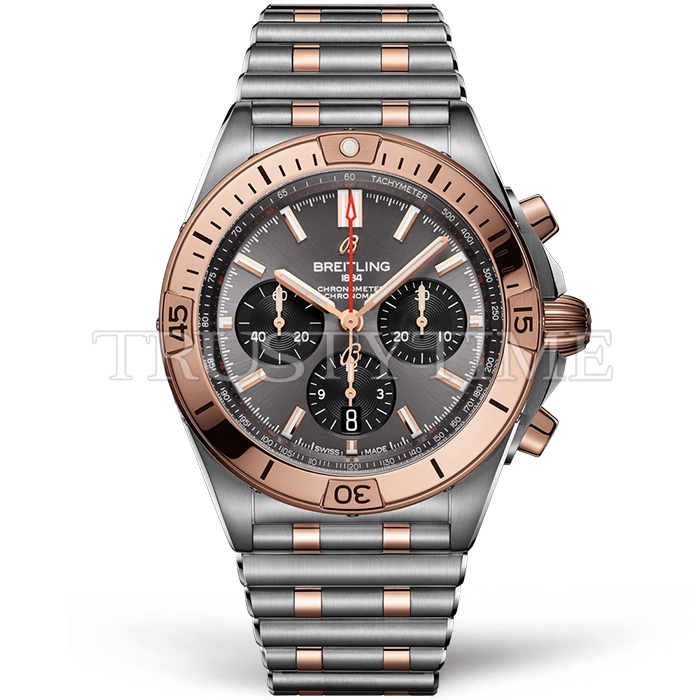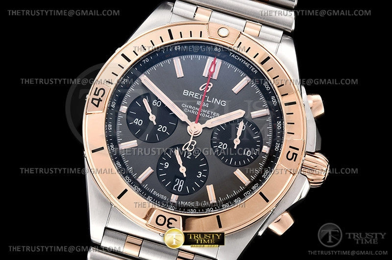 Часы Breitling из коллекции Chronomat B01. Спортивные мужские часы Breitling Chronomat B01 42 UB0134101B1U1 премиального качества (Артикул магазина: BT-0603) оснащены надежным автоматическим механизмом с автоподзаводом (работает от амплитуды движения руки) калибра Valjoux-7750, в котором реализованы следующие функции: часовая, минутная и секундная стрелки, а так же хронограф, дата. Круглый корпус часов комбинированного сталь с розового золота цвета, имеющий размер 42 мм и высоту 14.5 мм превосходно дополнит образ и украсит запястье своего обладателя. Для изготовления часов Breitling Chronomat B01 42 UB0134101B1U1 предлагаемых в нашем интернет-магазине, применяются нержавеющая сталь 316F высокого качества (Швейцарский стандарт), а так же сапфировое стекло высокой прочности, благодаря чему обеспечивается максимальная защита от сколов и механических повреждений. Отличительной чертой данной модели является серый циферблат, часовые индексы которого обеспечивают часовые метки. Завершает образ браслет из нержавеющей стали комбинированного сталь с розовым золотом цвета с фирменной раскладывающейся застежкой Breitling. Водонепроницаемость данной модели составляет 30М (WR30) – допускается минимальное воздействие с водой.