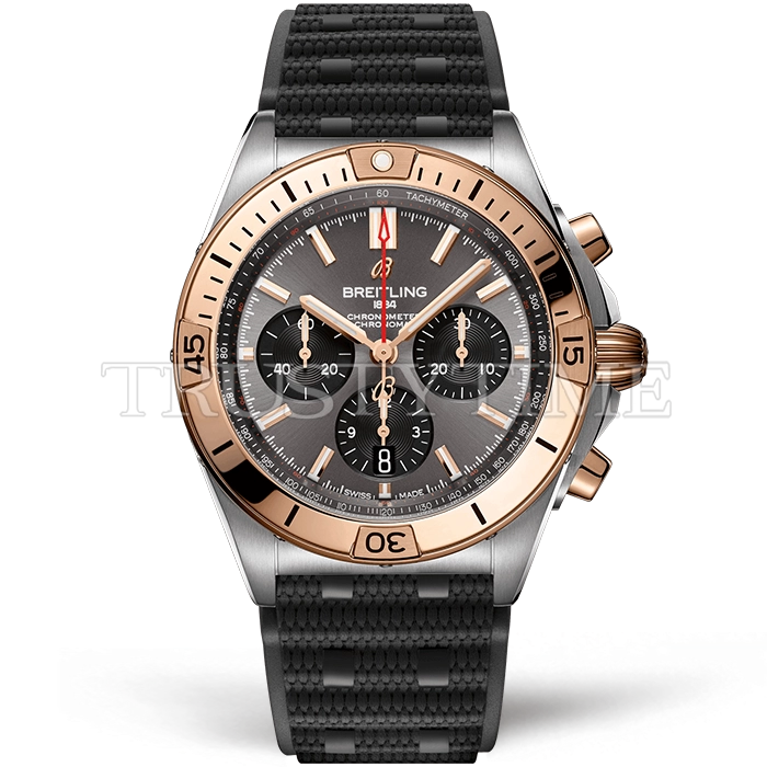 Часы Breitling из коллекции Chronomat B01 42. Спортивные мужские часы Breitling Chronomat B01 42 UB0134101B1S1 премиального качества (Артикул магазина: BT-1146) оснащены надежным автоматическим механизмом с автоподзаводом (работает от амплитуды движения руки) калибра Valjoux-7750, в котором реализованы следующие функции: часовая, минутная и секундная стрелки, а так же хронограф, дата. Круглый корпус часов комбинированного сталь с розового золота цвета, имеющий размер 42 мм и высоту 14.5 мм превосходно дополнит образ и украсит запястье своего обладателя. Для изготовления часов Breitling Chronomat B01 42 UB0134101B1S1 предлагаемых в нашем интернет-магазине, применяются нержавеющая сталь 316F высокого качества (Швейцарский стандарт), а так же сапфировое стекло высокой прочности, благодаря чему обеспечивается максимальная защита от сколов и механических повреждений. Отличительной чертой данной модели является серый циферблат, часовые индексы которого обеспечивают часовые метки. Завершает образ каучуковый ремешок черного цвета с фирменной классической застежкой Breitling. Водонепроницаемость данной модели составляет 30М (WR30) – допускается минимальное воздействие с водой.