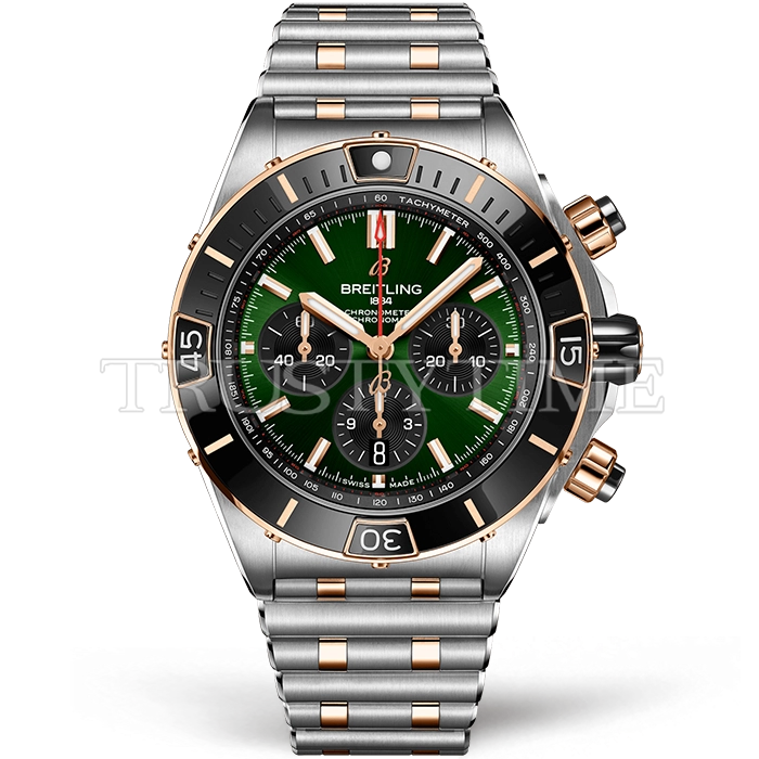 Часы Breitling из коллекции Super Chronomat. Спортивные мужские часы Breitling Super Chronomat B01 44 UB0136251L1U1 премиального качества (Артикул магазина: BT-1150) оснащены надежным автоматическим механизмом с автоподзаводом (работает от амплитуды движения руки) калибра Valjoux-7750, в котором реализованы следующие функции: часовая, минутная и секундная стрелки, а так же хронограф, дата. Круглый корпус часов комбинированного сталь с розового золота цвета, имеющий размер 44 мм и высоту 16.5 мм превосходно дополнит образ и украсит запястье своего обладателя. Для изготовления часов Breitling Super Chronomat B01 44 UB0136251L1U1 предлагаемых в нашем интернет-магазине, применяются нержавеющая сталь 316F высокого качества (Швейцарский стандарт), а так же сапфировое стекло высокой прочности, благодаря чему обеспечивается максимальная защита от сколов и механических повреждений. Отличительной чертой данной модели является зеленый циферблат, часовые индексы которого обеспечивают часовые метки. Завершает образ браслет из нержавеющей стали комбинированного сталь с розовым золотом цвета с фирменной раскладывающейся застежкой Breitling. Водонепроницаемость данной модели составляет 30М (WR30) – допускается минимальное воздействие с водой.