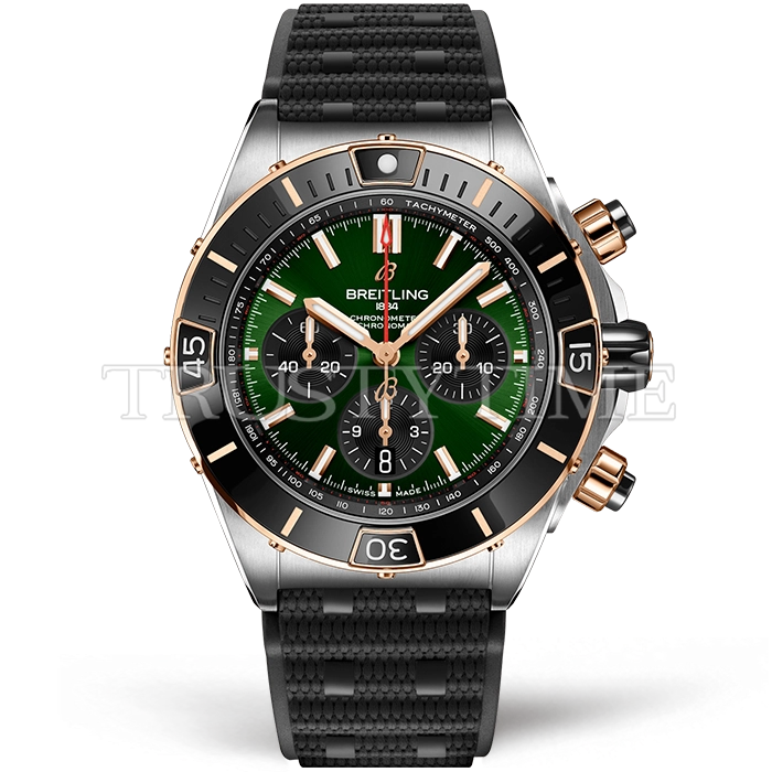 Часы Breitling из коллекции Super Chronomat. Спортивные мужские часы Breitling Super Chronomat B01 44 UB0136251L1S1 премиального качества (Артикул магазина: BT-1151) оснащены надежным автоматическим механизмом с автоподзаводом (работает от амплитуды движения руки) калибра Valjoux-7750, в котором реализованы следующие функции: часовая, минутная и секундная стрелки, а так же хронограф, дата. Круглый корпус часов комбинированного сталь с розового золота цвета, имеющий размер 44 мм и высоту 16.5 мм превосходно дополнит образ и украсит запястье своего обладателя. Для изготовления часов Breitling Super Chronomat B01 44 UB0136251L1S1 предлагаемых в нашем интернет-магазине, применяются нержавеющая сталь 316F высокого качества (Швейцарский стандарт), а так же сапфировое стекло высокой прочности, благодаря чему обеспечивается максимальная защита от сколов и механических повреждений. Отличительной чертой данной модели является зеленый циферблат, часовые индексы которого обеспечивают часовые метки. Завершает образ каучуковый ремешок черного цвета с фирменной раскладывающейся застежкой Breitling. Водонепроницаемость данной модели составляет 30М (WR30) – допускается минимальное воздействие с водой.