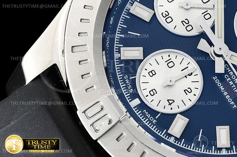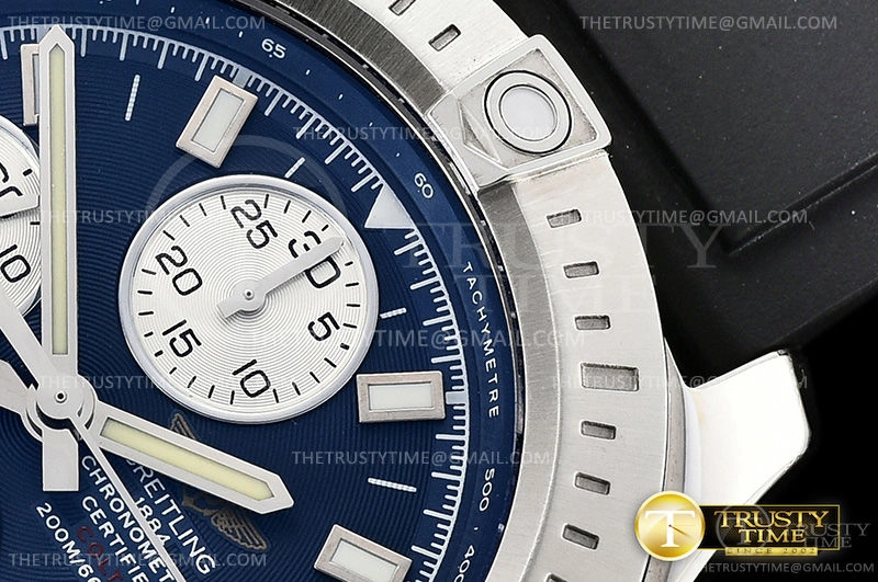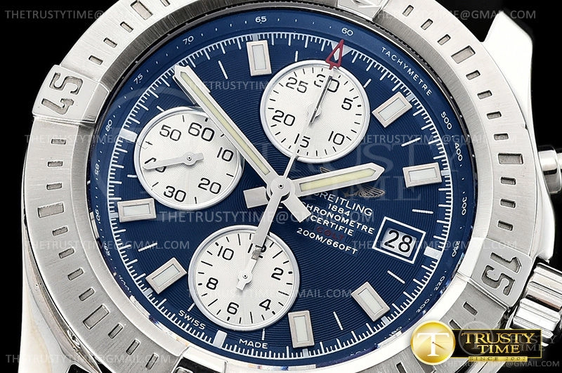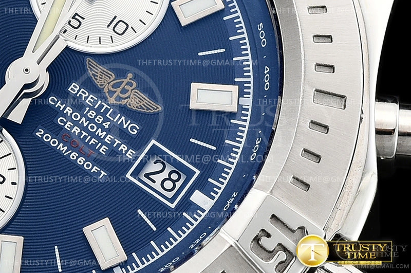 Часы Breitling из коллекции Colt Chronograph. Спортивные мужские часы Breitling Colt Chronograph Automatic 44 A1338811/C914/145S/A20S.1 премиального качества (Артикул магазина: BT-0414) оснащены надежным автоматическим механизмом с автоподзаводом (работает от амплитуды движения руки) калибра Valjoux-7750, в котором реализованы следующие функции: часовая, минутная и секундная стрелки, а так же хронограф, дата. Круглый корпус часов стального цвета, имеющий размер 44 мм и высоту 15 мм превосходно дополнит образ и украсит запястье своего обладателя. Для изготовления часов Breitling Colt Chronograph Automatic 44 A1338811/C914/145S/A20S.1 предлагаемых в нашем интернет-магазине, применяются нержавеющая сталь 316L высокого качества (Швейцарский стандарт), а так же сапфировое стекло высокой прочности, благодаря чему обеспечивается максимальная защита от сколов и механических повреждений. Отличительной чертой данной модели является синий циферблат, часовые индексы которого обеспечивают часовые метки. Завершает образ каучуковый ремешок черного цвета с фирменной классической застежкой Breitling. Водонепроницаемость данной модели составляет 30М (WR30) – допускается минимальное воздействие с водой.